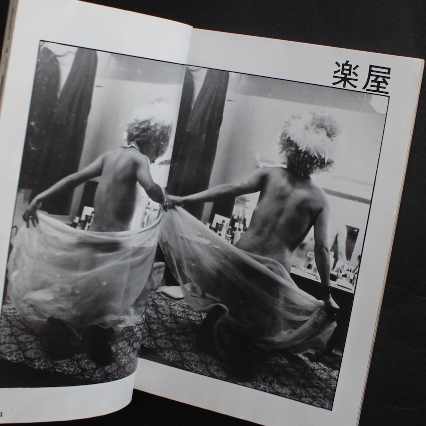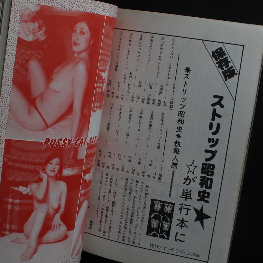 ストリップ専門誌として1966年(昭和41年)に中谷陽が創刊した『ヌード・インテリジェンス』の「57号 創刊13周年記念謝恩超特集」。 当初は実演レポートや劇場情報を扱う硬派なストリップ誌として出発し、ショー文化の成熟とともに誌面は独自のグラビア表現へと広がっていきました。1976年(昭和51年)に通巻50号を迎えると、表紙ロゴが“NU・IN”へ刷新され、誌面デザインもより視覚性を重視した構成へ移行します。写真のレイアウトやデザインが個性的で、モデルのポーズを大胆にトリミングした構図、カラーページの強い発色などが特徴となり、“昭和のストリップ”が持っていた様式美と即興性がそのまま紙面に刻まれています。読者投稿や短編小説を織り交ぜつつ、主要コンテンツはあくまでストリッパーの身体と舞台表現に焦点を当て、職業としてのストリップを日常的な文化として記述し続けた点でも特異な存在でした。1982年(昭和57年)に終刊しましたが、艶笑誌とも一般的な写真雑誌とも異なる“舞台文化の記録媒体”としての姿勢は他に類例が少なく、今日では雑誌史・風俗史双方から貴重な資料として評価されています。