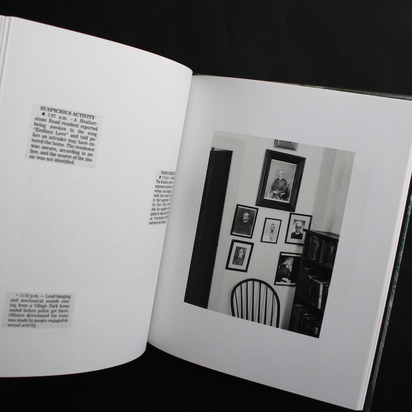アメリカの写真家Aaron Schumanの作品集『SLANT』。シューマンは、写真と言葉、編集構造の関係性に強い関心を持ち、イメージそのものよりも、それらが並置されることで生まれる認識のずれや違和感を探ってきた作家です。本作では、マサチューセッツ州アマースト周辺の地方紙に掲載された「Police Reports」欄の短文と、同地域で撮影された写真を組み合わせ、テキストとイメージの間に意図的な不協和を生み出しています。当初は小さな町への親しみを帯びた視点から始まった試みは、2016年以降のアメリカ社会に広がる不安や疑念を背景に、次第に不穏な響きを帯びていきます。タイトルは、同地にゆかりのある詩人エミリー・ディキンソンが用いた「slant rhyme(斜め韻)」の概念に由来し、写真と言葉が完全には重ならない関係性そのものを示唆します。本書は、日常の表層の下に潜む歪みや緊張を、説明ではなく構造によって静かに浮かび上がらせる一冊です。