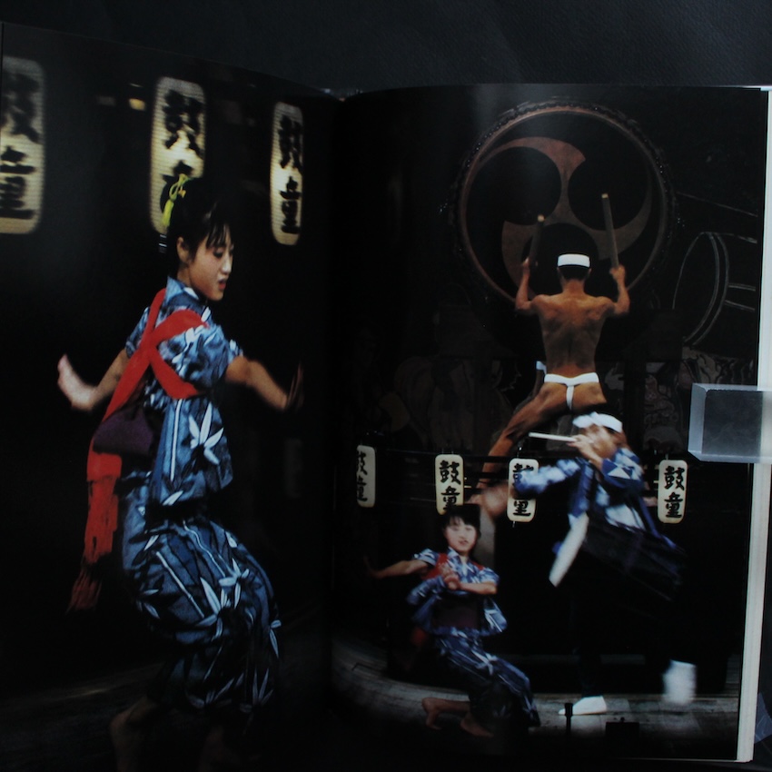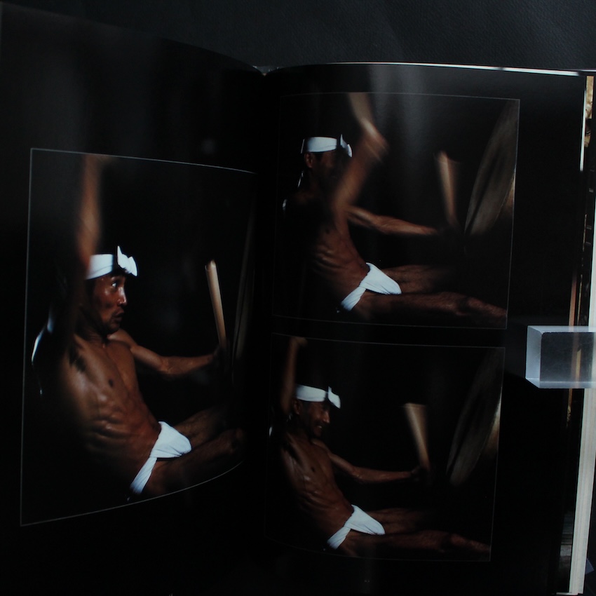 日本の写真家・星野小麿の写真集『鼓童 / Kodo』。1984年に日本芸術出版社から刊行された本書は、佐渡を拠点に活動する和太鼓集団 鼓童 を被写体に、その舞台表現と身体性を正面から捉えた大型写真集です。鼓童は1980年代初頭に結成され、太鼓を中心とした伝統芸能を、現代的な舞台表現として再構築しながら国内外で活動を広げてきました。その演奏は音楽であると同時に、肉体の緊張や呼吸、集団としての動きを強く伴う表現として知られています。星野はそうした鼓童の特質に向き合い、演奏の瞬間に立ち上がる力感や集中、身体と太鼓が一体化する場面を、舞台記録にとどまらない視点で写し取っています。大判の誌面構成は、個々の演者の動きだけでなく、集団が生み出す空間全体のうねりを伝えるための装置として機能しており、写真を通じて鼓童という表現の本質に迫ろうとする姿勢がうかがえます。本書は、鼓童の初期活動期を視覚的に記録した資料であると同時に、日本の身体表現と写真の関係を考える上でも興味深い一冊です。