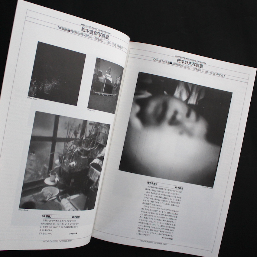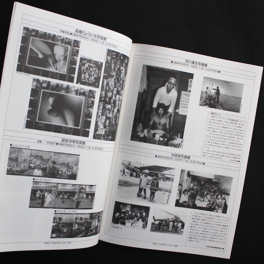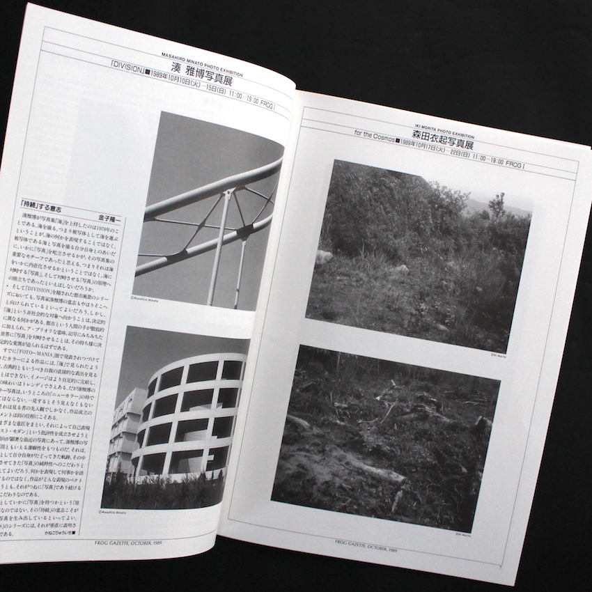 こちらは1990年代初頭より四谷にあった写真ギャラリー「Frog(Film Round Gallery)」より刊行されていた写真情報誌で、1989年1月から1991年10月号を最後に月刊号として計34号まで発刊されました。その後「Frog」は、情報誌はやめて写真展の企画・運営や、写真集の刊行等をメインに「mole」として活動が続けられ、1990年代の自主ギャラリーの中心的存在でした。ちなみに「Frog」の前身は「ルナハウス」と呼ばれるフリースペースで、そこではYCM(四谷コンテポラリーミュージアム)という写真家メンバー数名によって営まれていたグループが、様々な企画展を催していました。「Frog Letter / Frog Gazette」は、当ギャラリーで行われる写真展の紹介の他、写真家や評論家などによるエッセイや論文なども収録されており、第1号の島尾伸三から始まり、鈴木志郎康、伊藤俊治、大辻清司などが執筆を担った他、金子隆一や飯沢耕太郎らも定期的に連載を行い、金子は写真集の名著の解説などを行なっていました。「読み物」的要素が強いものですが、90年代の「コンテンポラリー」な写真家たちの取り組みや動向を知るには大変貴重な情報誌になります。