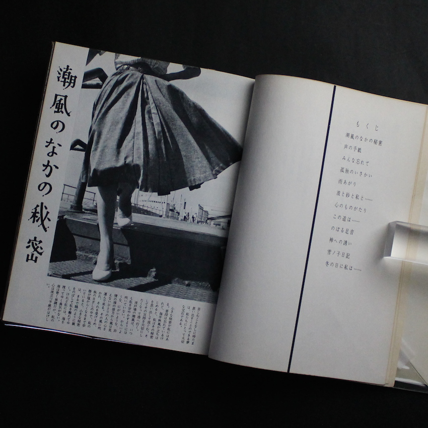 日本の写真家船山克の写真集「青春の彷徨 Photo Story」。戦後に活躍したフォト・ジャーナリストとして名高い船山克。1945年より影山光洋・秋元啓一らが在籍し、当時花形であった朝日新聞出版局写真部に所属。大束元・吉岡専造と共に「朝日の三羽烏」と評され、当局に頻繁に出入りしていたドキュメンタリー写真家長野重一らにも、多大な影響を与えたそうです。本書は1958年に刊行された作品集で、揺れ動く若い女性の繊細な心情を描写したフォト・ストーリー。自身が設定したテーマのもとに撮影された図版を、詩人・随筆家として名高い串田孫一が写真からイメージを膨らませてテキストを添え、いち女性が青春時代を卒業し、仕事・恋愛・趣味等を通じて大人に成長していく姿を綴ったユニークな一冊。プレス・カメラマンと作家が、ジャーナリズムの枠を超え、コラボレーションして創作した女性の心の記憶のエッセイ集。