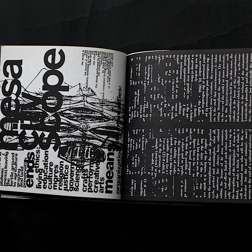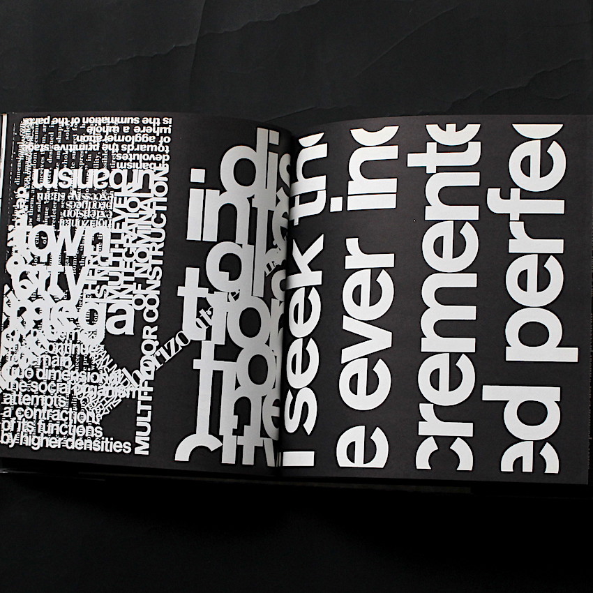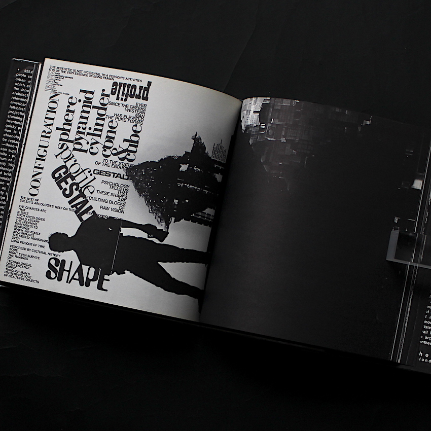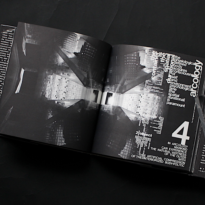 イタリア生まれの建築家パオロ・ソレリ(1919-2013)。1947年にアメリカに渡り、フランク・ロイド・ライトのもとで建築を学ぶと、未来の都市計画を専門とし、アーキテクチャーとエコロジーを掛け合わせた「アーコロジー」(Arcology)を提唱。その思想を具現化するために、1970年にアリゾナ州の砂漠地帯に実験都市「アルコサンティ」を開発し、今なお(ソレリの死後も)その開発は継続しています。本書は、人口増加や環境破壊、文化の進歩など未来への鋭い洞察から、自然と建築の調和を目指す未来都市の新たなヴィジョンを提示したソレリのラディカルな美学や哲学を、グラフィカルに表現。著書でもあるDonald Wallによる実験的なエディトリアル・デザインは、その大胆なタイポグラフィに顕著ですが、50年代のコンクリート・ポエトリーや70年代のフルクサス、そして後に勃興する90年代のタイポグラフィなどが引き合いにだされるなど、視覚的にソレリの思考へと近づく1冊です。
