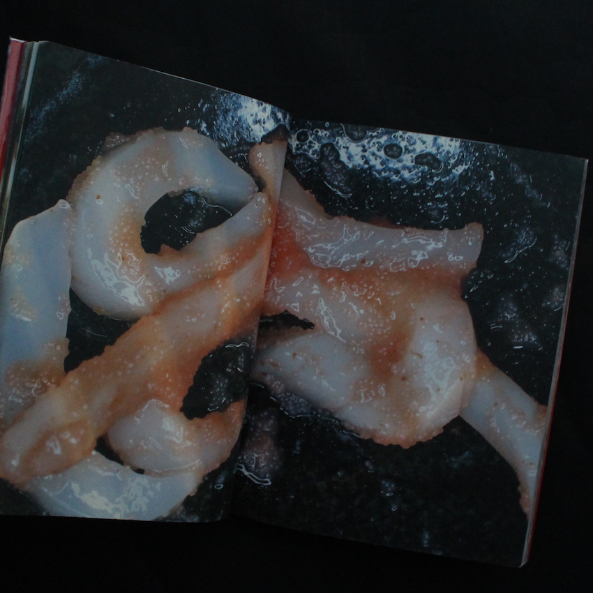 日本を代表する写真家・荒木経惟(1940-)の写真集『食事 / The Banquet(Signed)』。下駄職人でアマチュア・カメラマンであった父の影響で写真を始め、千葉大学工学部写真印刷工学科を卒業後、電通に就職。仕事の傍ら、1971年に私家版『センチメンタルな旅』を発表し、写真家としての道を切り出し、現在までに500冊もの写真集を刊行し、国内外で大規模な個展を成功させています。本書は、タイトルの通り、荒木が摂った食事の写真です。作ったのは荒木の写真を語る上で不可欠な愛妻であり夭折した陽子。カラーで接写された食事は生々しくグロテスクでありながら、荒木らしいエロティックな印象を与え、また、記された食事の豊富なメニューを見ると、そこに陽子の愛が感じられます。「食事は死への情事だった」と綴られる後半部は、余命1ヶ月の手料理となり、一転してモノクロに。荒木と陽子という日本の写真史にも残る夫婦の関係が、食事からも垣間見ることができる1冊です。Parr & Badger Vol.Ⅰ掲載。帯付。写真家サイン入り。