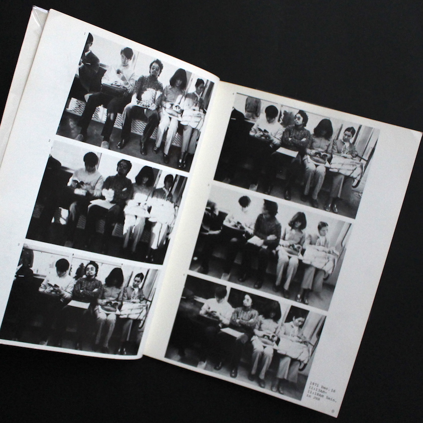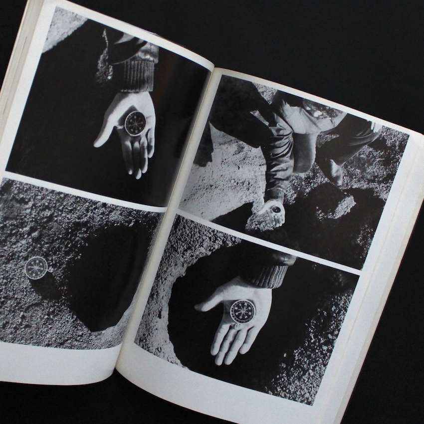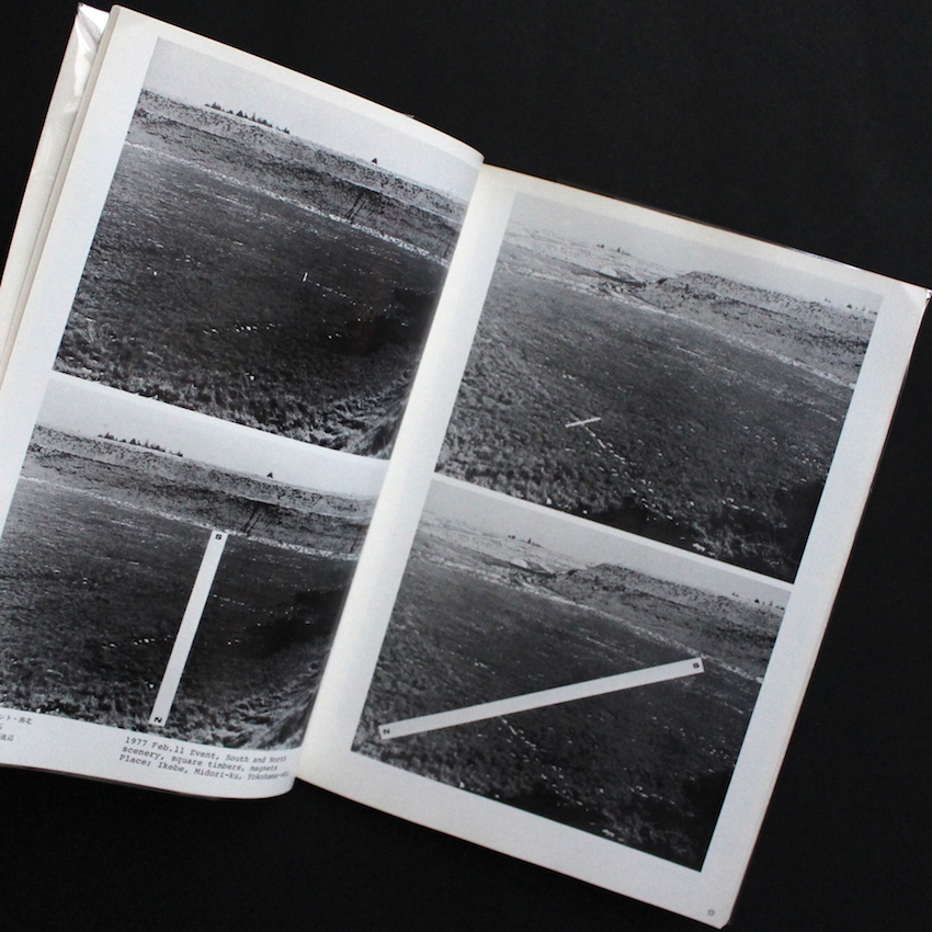 日本の現代アーティストである大坂日出男(1943-)の作品集『Hideo Osaka 1971-1980』。1967年に初個展を開催してから1981年までに個展やグループ展で制作発表をしており、70年代は精力的に活動をしていた大坂日出男。1971年には国際青年美術家展にて、日本文化フォーラム賞を受賞しています。起業にともない制作自体は休止していますが、本書は大坂の作家としての軌跡をまとめた1冊となっています。写真を用いたコンセプチャルな作品を制作していた大坂ですが、冒頭の解説で「日常的時間の知覚は脈打つ心音の鼓動のごとく、移行する生命体の存続を認識させる」という大坂の発言が引かれており、時空間の変遷をテーマにした作品が特徴的です。電車の座席に座り(大坂自身も座っている)、5分の間、定点で6枚の写真を切った「国電車内」や天体を長時間露光で写し、その軌跡をモチーフにした作品など、時間とともに変化する光景や日時計的に変化する影などを、自身を被写体としながら複数枚の写真で構成して作品化しています。写真家サイン入り。