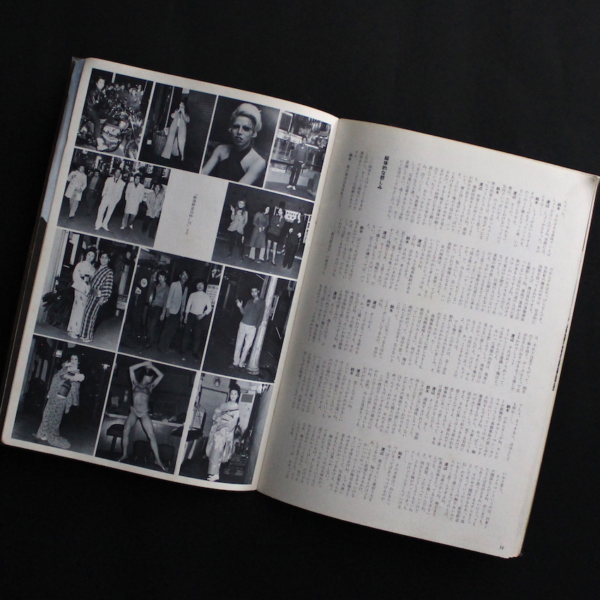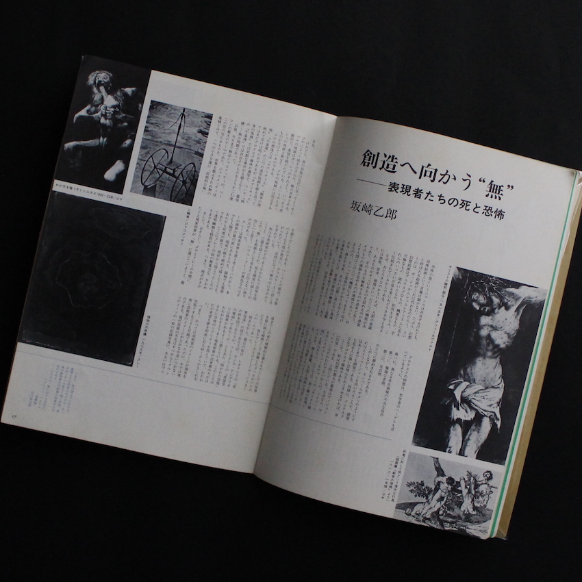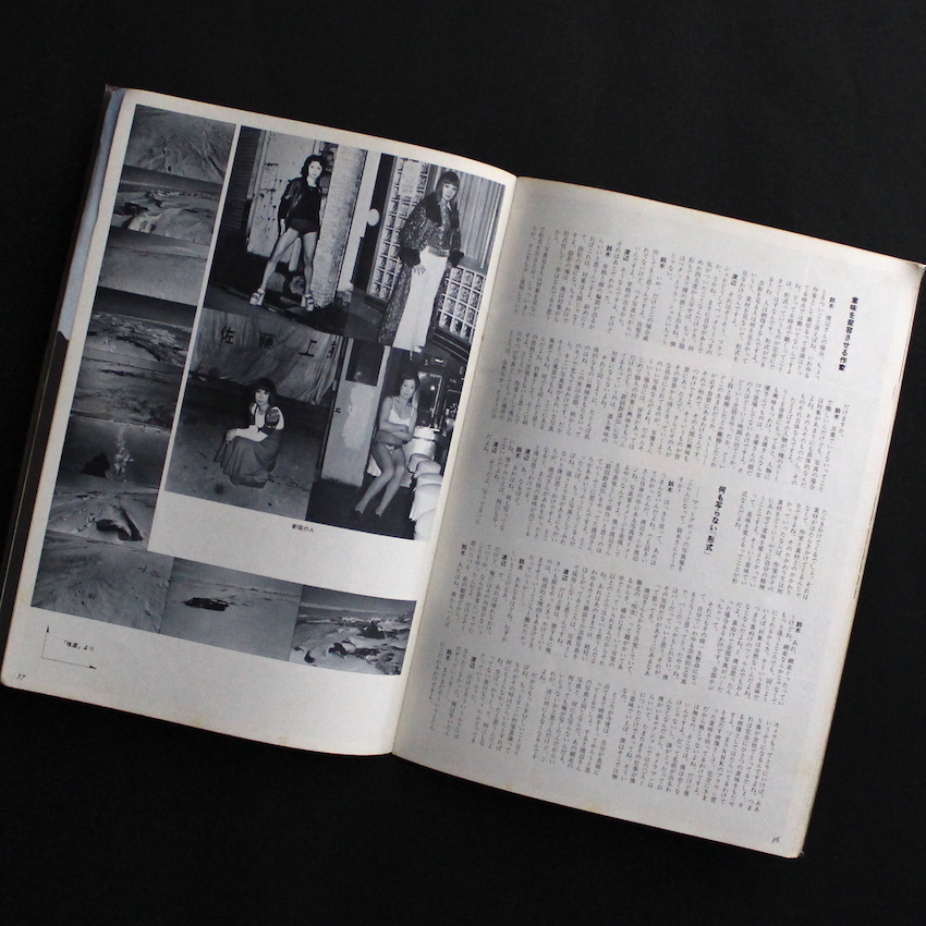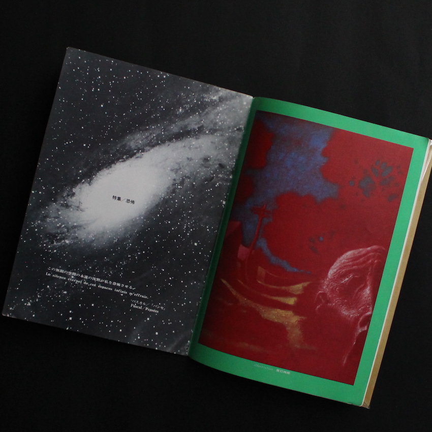 1975年に季刊雑誌として創刊した『無次元』。創刊号の特集は「恐怖」。横尾忠則が表紙を描き、詩人でありエラリー・クイーンの『Yの悲劇』の翻訳でも知られる田村隆一の「恐怖に関する詩的エスキイス」や文芸評論家・秋山駿の「私的恐怖論」、絵本作家の長新太「幽霊の言い分」、美術評論家・坂崎乙郎「創造へ向かう“無”」、アメリカ文学者・八木敏雄「恐怖と現実とフィクションと」などのテキストを収録。また、「写真概念の彼方より」では、写真家の渡辺克巳とTVカメラマンであり詩人の鈴木志郎康が対談し、1973年に出版された『新宿郡盗伝66/73』の話などをしています。編集人の杉浦洋一は、創刊の挨拶として、「強いてジャンルを固定することなく、美術・文学をはじめとして様々な分野にわたって人間の根源をさぐるユニークな表現媒体として在り続けたいと念じております」と記しています。