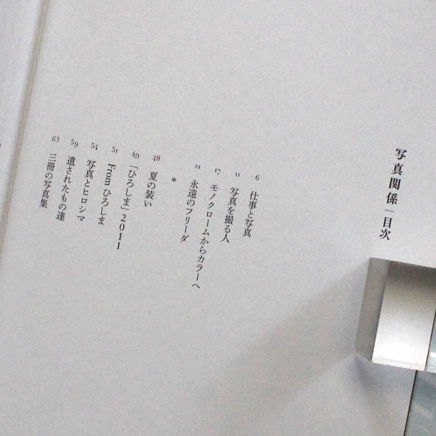 日本が世界に誇る写真家・石内都の作品集『写真関係 -写真とエッセイ-』。1970年代後半から写真を撮り始め、当時は写真とは全く関係のない仕事をこなしながら土日に撮影、1979年に発表した2nd写真集『APARTMENT』で女性初の木村伊兵衛写真賞を受賞、一躍脚光を浴びながらも、コマーシャルは一切を受けず、自身が感じ、自身と重なり合う「匂い」や「気配」を描写し続けた石内都。1990年以降は『1・9・4・7』『Mother's』『ひろしま』、そして近年の『Frida by Ishiuchi』等、対象を「ヒト」「モノ」に移し変えた接写を通じて、その背景に宿るストーリーを丁寧に紡いできた写真家です。本書は、2016年に刊行された作品集で、約50点の写真図版に加えて、「モノクロームからカラーへ」「From ひろしま」「Mother's」「上州の女たち」「三冊の写真集」などのエッセイが収録されており、写真集制作の裏話や写真家としての思いなどが綴られています。
