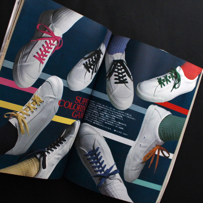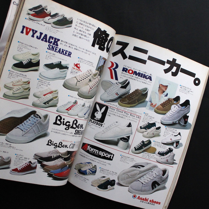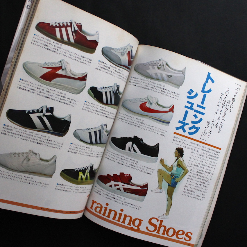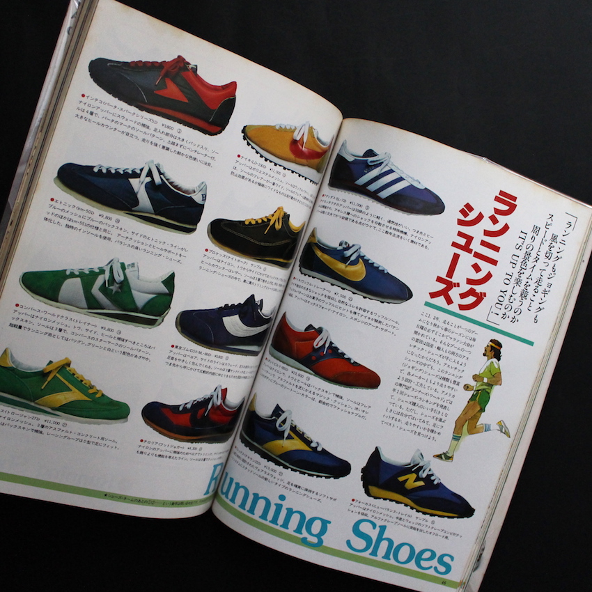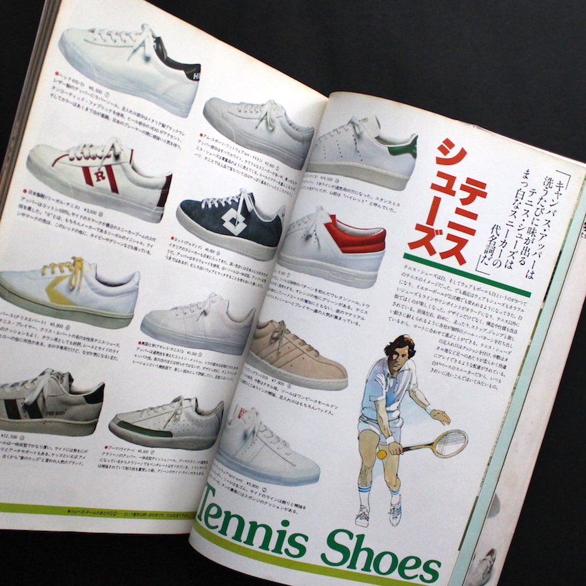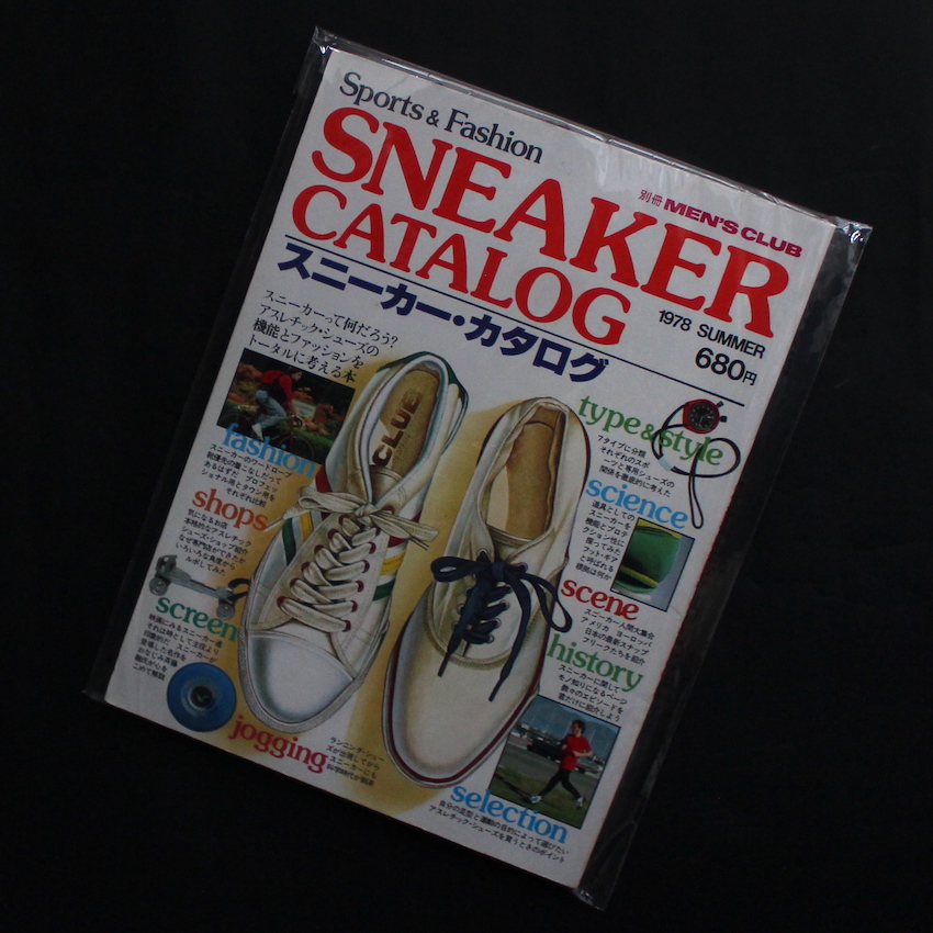 雑誌『メンズ・クラブ』の別冊として1978年に発行された『スニーカー・カタログ』。編集後記に「スニーカーという名の運動靴。ときにはアスレチック・シューズと呼ぶこともありますが、とにかくこのスニーカーがいますごい人気です」とあるように、今では当たり前に使われるスニーカーという言葉が若い人たちの間で一般化し始めた頃のようで、そのラインナップも豊富になってきたことが本書の背景にはあるようです。「バスケット」「テニス」「デッキ」「ランニング」「トレーニング」「スケートボード」「カジュアル」にカテゴリーが別れており、コンバースの「オールスター」(チャックテイラー)、アディダスの「スタンスミス」(もちろんフランス製)、そしてナイキの「ワッフル・トレーナー」など、現在も名作として語られるスニーカーが紹介されています。アメカジのバイブルとも言える『MADE IN USAカタログ』が発行されたのが1975年で、体裁も含め本書も似た雰囲気がありますが、メジャーからマイナーブランドまで当時のスニーカーを網羅的に紹介した資料価値のある1冊です。