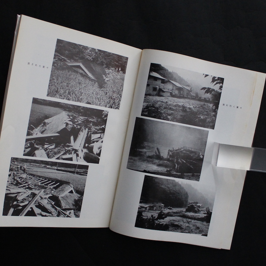 1975年8月20に秋田・青森地域を襲った集中豪雨。秋田県比内町の中央を流れる犀川(さいがわ)は、その清らかな流れで同町のシンボルにもなっていましたが、豪雨によって氾濫し、大洪水を引き起こしました。本書『犀川豪雨の記録』は、洪水により家や橋が流され、道路は削られ、田畑は土砂や流木で覆われてしまうなど、その甚大な被害や救援の様子をドキュメントした1冊です。編集には現地で活動していたグループだと思われる「写真集団ひない」とクレジットされていますが、彼らに加えて「写真教室」(同グループが主宰していたと思われる)の方々や「さきがけ新報社大館支局」の写真を寄せてまとめあげたようです。巻末に添えられた「編集を終えて」では、洪水の翌日8月21日に自衛隊のヘリコプターに乗り込み、「この現場を空より見て、とうてい私一人の手におえる被写体ではないことを感じた。だが何んとかしてこの町予算三年分をゆうに呑んだ大きい災害を世にアピールしなければならないと思った」と、ジャーナリスティックな視点を持って撮影が行われ、本書が作られた様子が伝わってきます。