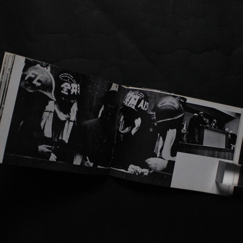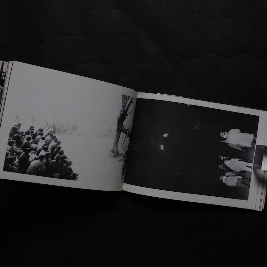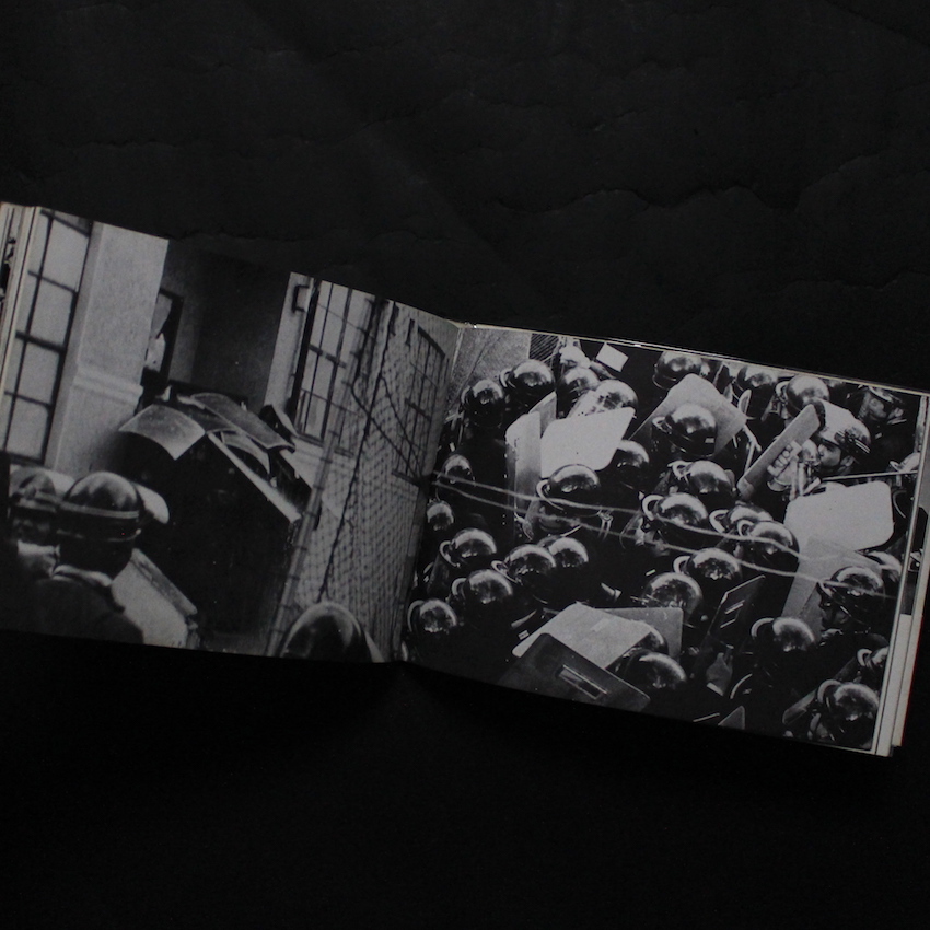 関西学院大学全学共闘会議出版局から発行となった『Non : 関学闘争の記録 / Non : Record of the Kansei Gakuin Struggle』。大学と学問のあり方を問うところから、60年代に各地、各大学で学生運動や大学紛争が行われましたが、本書は、1967年に学費の値上げに端を発した関西学院大での闘争の様子を記録した1冊で、1969年までが記録されています。ヘルメット姿の学生たちで埋め尽くされた集会、隊列をなす機動隊、また機動隊と対峙する学生たち、学内に掲げられたプロパガンダなど、写真のクレジットはありませんが、この時代特有の空気感とともに、生々しく、臨場感のある写真が続きます。コンパクトな横長の判型ですが、断ち落としやレイアウトが効果的で、写真集としての工夫が感じられます。「“NON”“NON”“NON”と繰り返されたこの闘争は、日常性から非日常生に、そして、それが日常性へと回帰する不連続線である。“NON”は今後も生き続けるであろうし、創造へ続く、“拒否”の闘いとならねばならない」(巻末のアピールより)。(The Japanese Photobook 1912–1990 収録)