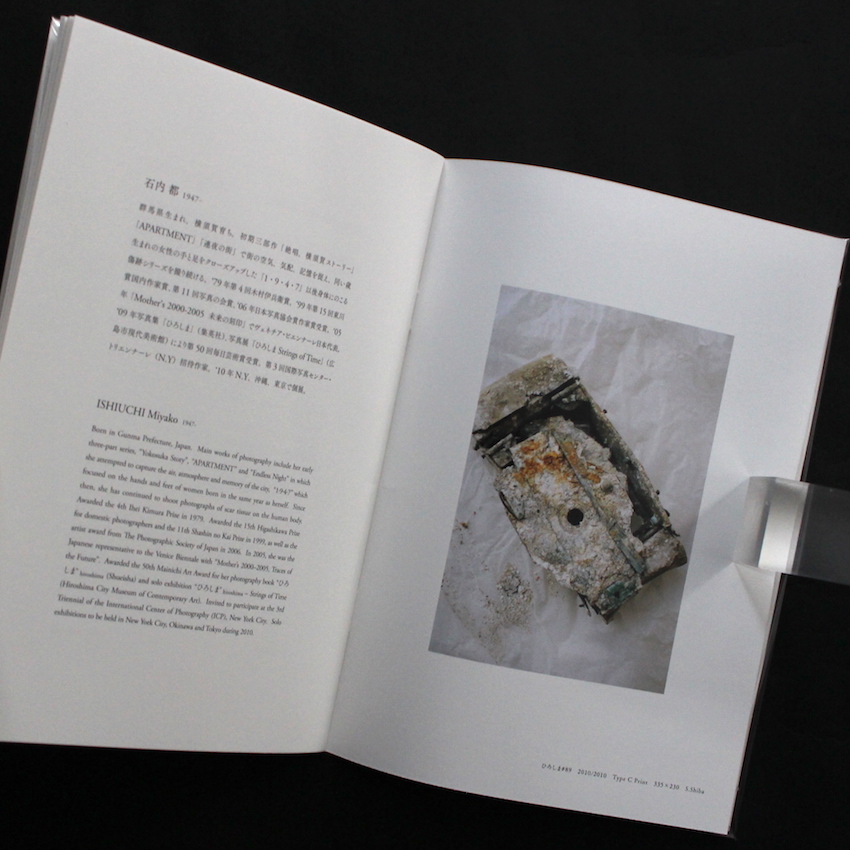 日本を代表する女性写真家・石内都の写真集『ひろしま in OKINAWA』。多摩美術大学で織りを学び、1975年より独学で写真を撮り始め、思春期を過ごした横須賀や、日本各地の旧赤線跡地などを撮影した粒子の粗いモノクローム写真で注目を集めた石内都。90年代以降は『1・9・4・7』『マザーズ』など、時間と記憶を刻む身体との接写の創作に意欲的に取り組んでいます。本書は、2010年に沖縄の佐喜眞美術館にて開催された展覧会に際し発行されたブックレットです。2007年に広島平和記念資料館に収められている被爆者の衣服や装飾品などの“肌身に直接触れた”遺品を写し出した石内は、その後広島で同写真の展示を開催し、東京、群馬と巡回し、沖縄へとたどり着きました。2010年に新たに撮影された遺品も多く、2008年に出版された写真集『ひろしま』とは異なる図版も収録されています。以下、本書の石内のテキストより。「沖縄の現実の肌ざわりを“ひろしま”がもたらしてくれた。被爆した遺品の数々は過去の忘れ物ではなく、今あり続ける物として、私と同じ時間と時代を分かち合っている」。写真家サイン入り(Signed)。
