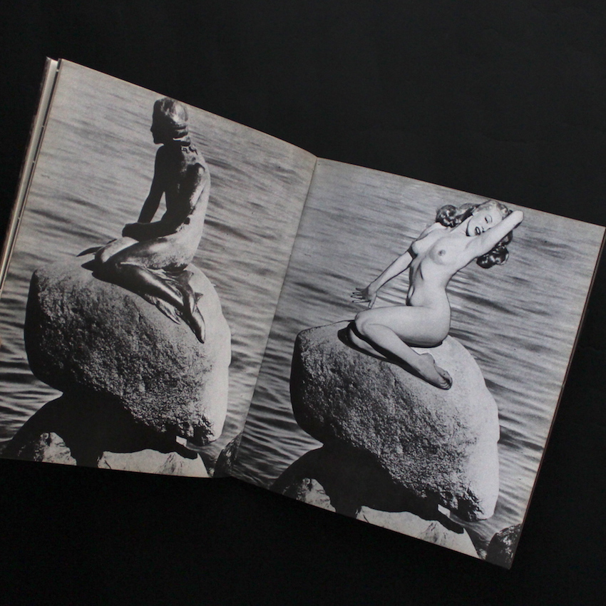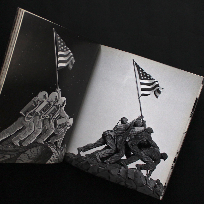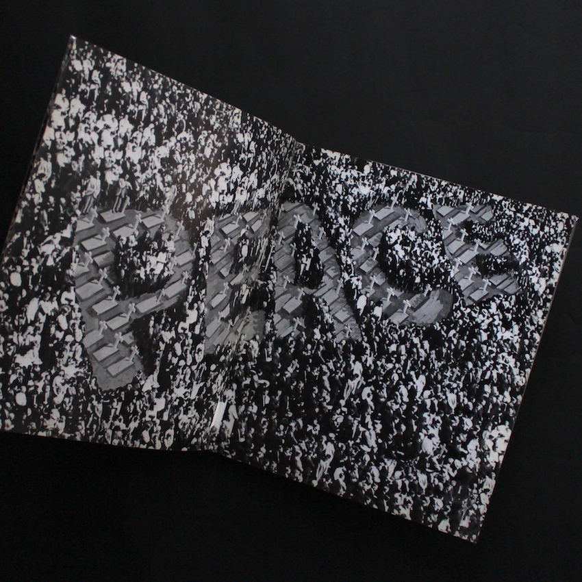 日本のアーティスト、マッド・アマノの作品集『SOS』。東京芸大を卒業後に日立の宣伝部に所属していたというマッド・アマノ。1978年に文芸春秋漫画賞受賞し、同年にロサンゼルスへ移住(10年後に帰国)。1981年からは週刊誌『FOCUS』の創刊とともに「狂告の時代」と題した連載を開始し、休刊まで続けていました。マッド・アマノと言えば、「パロディ裁判」で知られ、コラージュで使用した写真が、引用か権利侵害かが争われました。本書は、1970年に私家版で発行された作品集で、裁判の原因ともなったカレンダーに使われたスキーの写真を用いたコラージュ作品も収録。群衆のクローズアップを徐々に引いていくと、群衆の中に「PEACE」とかたどられた墓地が登場し、さらに目線を引くと群衆は「WAR」とかたどられている……。本書には、写真のコラージュや写真上に絵を描くことによって、意味の倒錯や転用・転換が試みられたユニークな作品が並びます。ウィットやユーモアに富み、単純にヴィジュアルとして楽しめる、様々な意味で日本のアート史に残る1冊です。