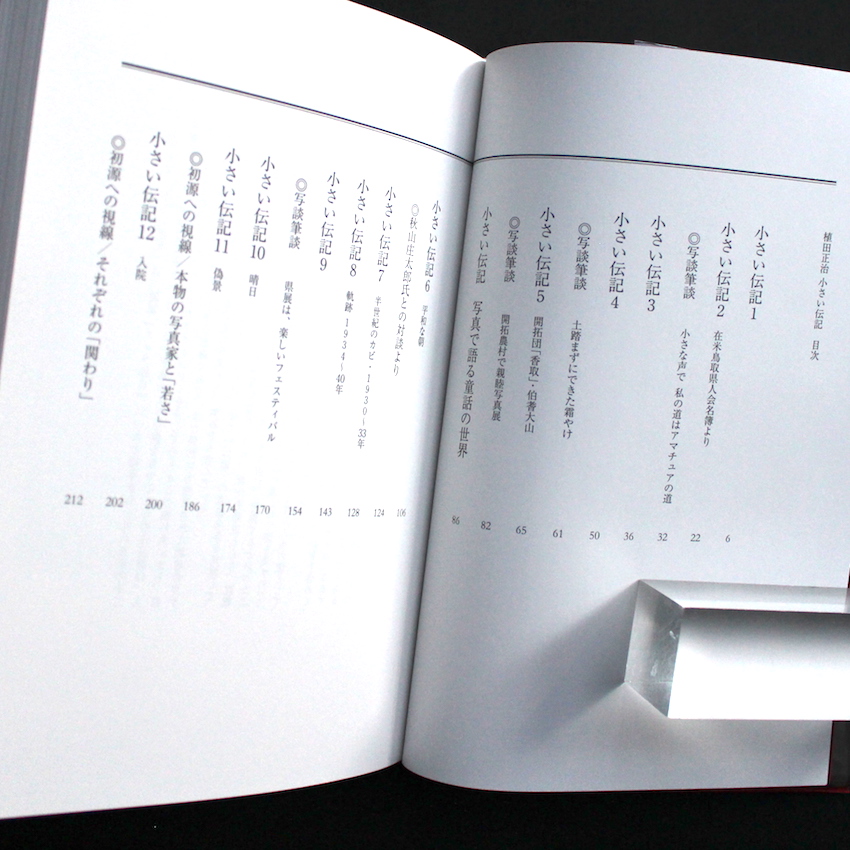 1974年から85年までの12年間で計13回雑誌『カメラ毎日』で発表された、植田正治による「小さい伝記」シリーズ。本書では、初出連載に近い形で図版をまとめ、さらには同時期に書かれたテキストも内包した「小さい伝記」決定版。以下、本書より「『小さい伝記』というのは、私にとってカメラを介しての触れ合いの記述というようなものであろうか。写っている人たちにとっては、今日に生きた証しとして、片隅の、小さな伝記になるのではなかろうか、とおもったり、それ自体、私にとっても、ひとつの過去の記録であろうとしての題名であると、いささかこじつけがましくて恥ずかしいが、自らを納得させているのである」。文庫本大サイズながら、200ページ強の中に豊富な図版が収録されている他、貴重な当時の日記や写真への姿勢など植田のコトバも堪能できる、うれしい一冊です。2008年刊行・初版。