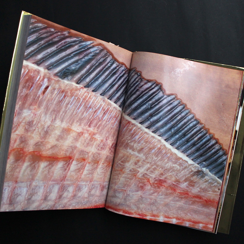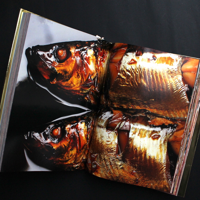 50年代後半から現在に至るまで第一線で活躍する写真家、篠山紀信の写真集『食 / Food(Signed)』。70年代の「激写」シリーズや90年代のヘアヌード写真集などが一般的に知られる一方で、初期の代表作である『家』のような、人間の営みと深く関わるモノやコトにフォーカスした作品でも大きな功績を残している篠山紀信。本書も『家』と同じく潮出版社から発行となった、食を題材に日本人の生活や食文化に焦点を当てた1冊。魚や肉といった日本人に馴染み深い食材や、活造りや蒲焼、天ぷら、そばやうどんといった日本人が育んだ食文化を丹念に写し出しています。ディテールに寄って、食材や調理された対象を生々しく切り取ったものが多く、そこに強い意味を感じますが、そこに素材を活かす日本人の食文化が投影されているのかもしれません。写真のインパクトと対をなすのが、大胆に金色で覆われた装丁などのブックデザイン。宮沢りえのヌード写真集『Santa Fe』をはじめ、90年代の篠山の写真集に欠かせない存在であるデザイナー井上嗣也の手によるものです。