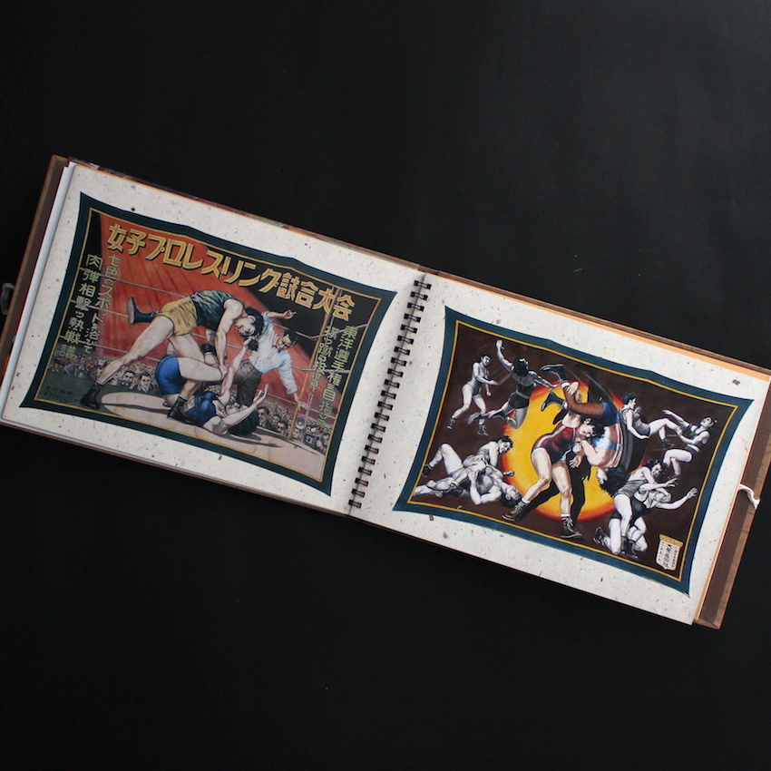 お祭りや縁日で異彩を放った・見世物小屋。日常とは隔絶された物珍しさといかがわしさが入り混じった興行が行われた見世物に魅せられたカルロス山崎が、全国の見世物小屋をめぐり、取材したものをまとめたのが本書『オール見世物』です。独特のタッチで描かれた、おどろおどろしい絵看板をはじめ、実際の写真、出し物の説明(口上)、告知ポスターや配られた大入り袋などの資料が満載。蛇女や人魚、人頭蜘蛛娘、人間ポンプ、奇形児、女ターザン、サーカスや動物の曲芸、女子プロレスなど、見たいような見たくないような大衆の興味をくすぐるような出し物の数々が紹介されています。現在はなかなかお目にかかることができない見世物小屋という文化を地道な取材で明かした貴重な1冊です。リング綴じの造本で、ページの一部は折返しの仕様になっており、絵看板と説明が対になって紹介されていたりと凝ったつくりになっています。