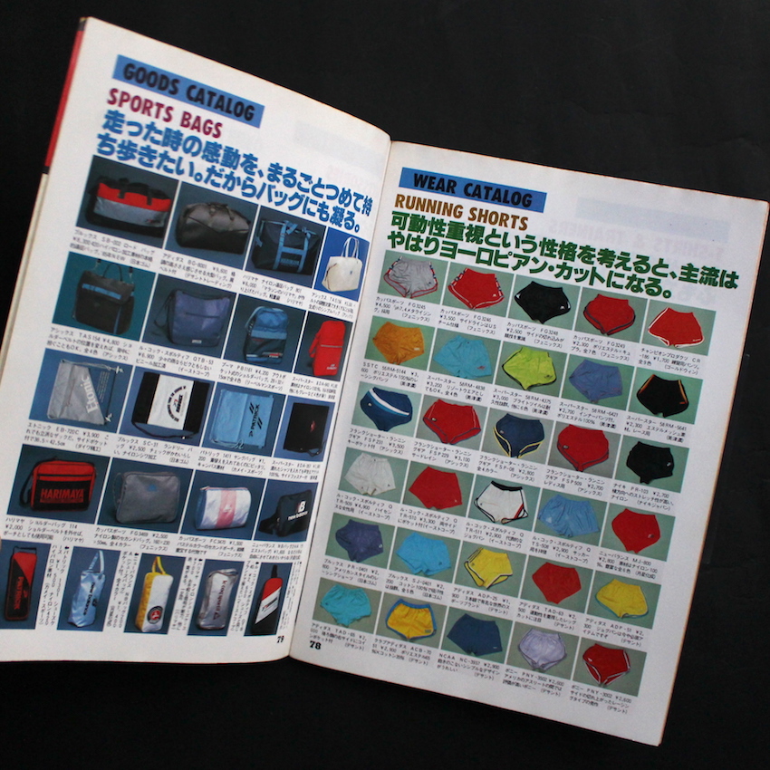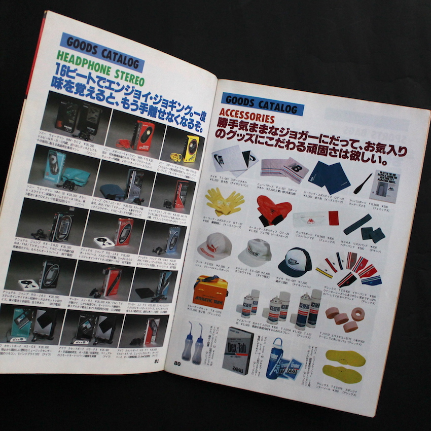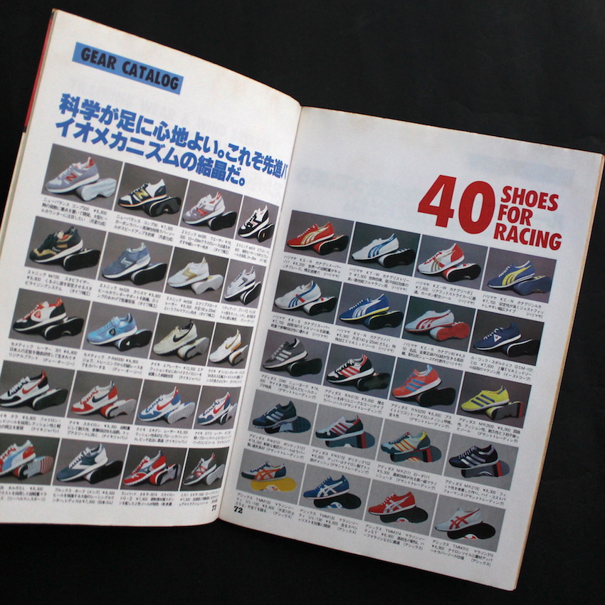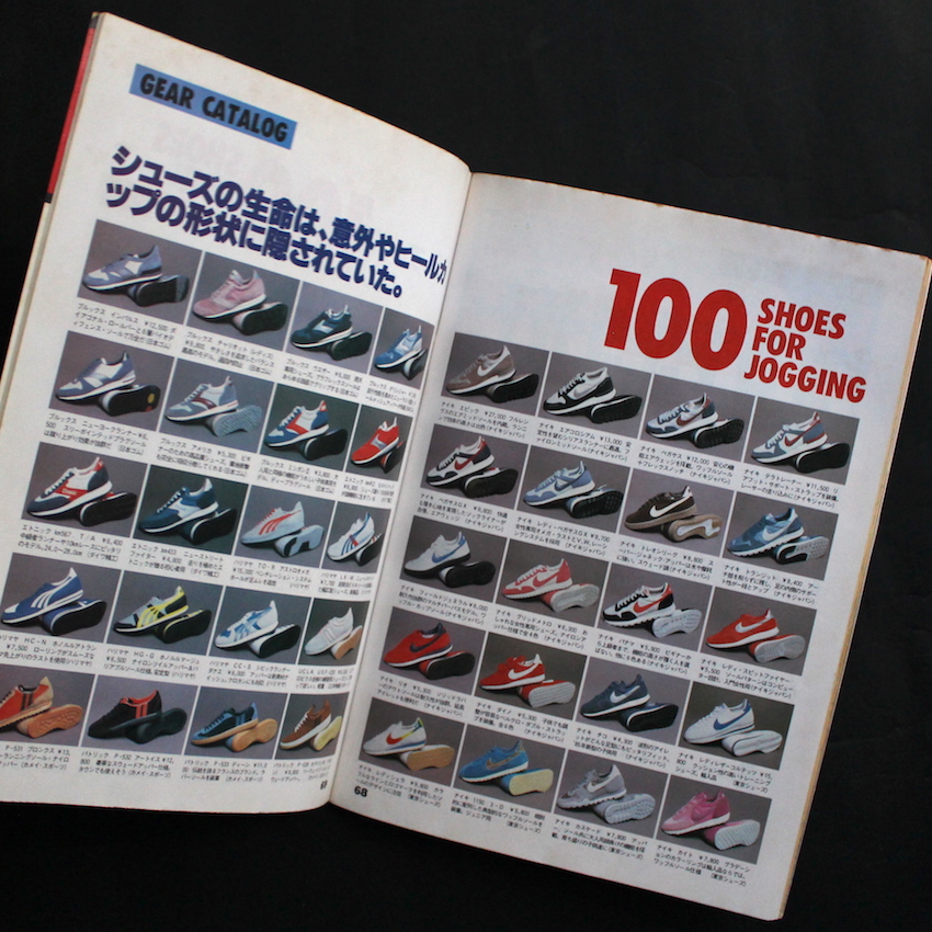 本書は、70年代から80年代にかけて多くのサブカル本を発行していた今はなき出版社・鎌倉書房による『スポーツノート Vシリーズ』の第14号で、テーマは「ジョギング」。戦後の経済成長を背景に、ライフスタイルが充実し始めて余暇も生まれ、趣味にもお金をかけられる人が多くなってきた70年代~80年代の日本。そういったニーズを満たすべく、衣食住関連の様々な雑誌も生まれており、スポーツ・ノートは、主にスポーツ初心者向けのHow to 本として、50近い各種スポーツを紹介したムック本を刊行した他、増刊号・Special Issueもいくつか出しています。80年代半ばからは「Vシリーズ」にモデルチェンジしており、本号では、ホノルルマラソンの特集から始まり、ランニングシューズの構造分析のほか、おきまりの「シューズ」「ウエア」「グッズ」などの写真図版も収録されています。