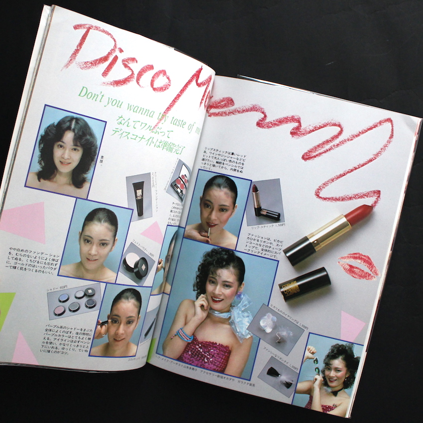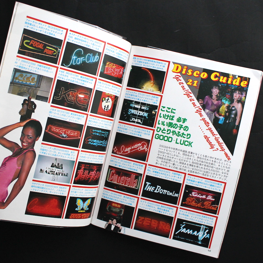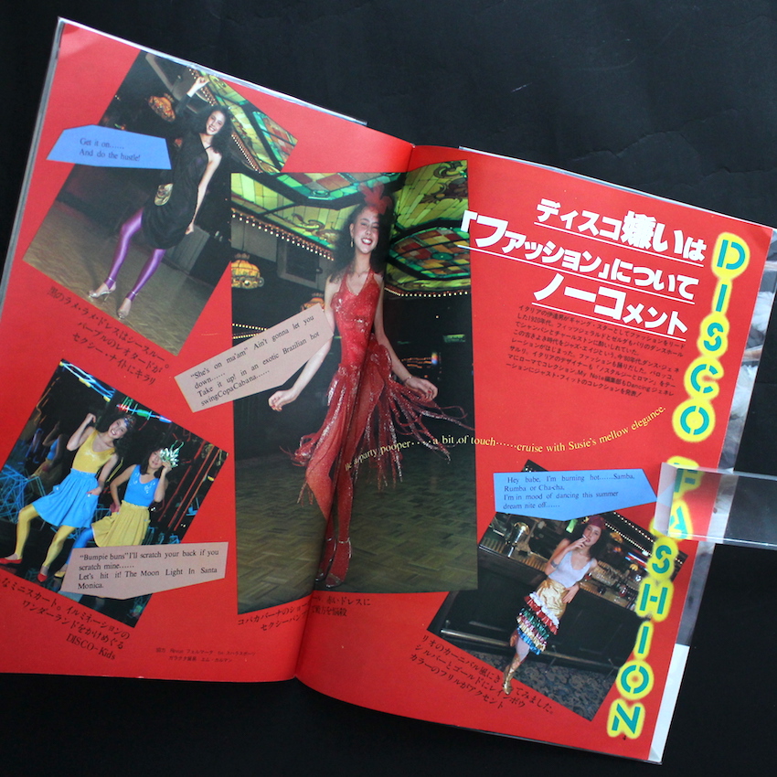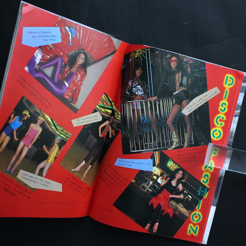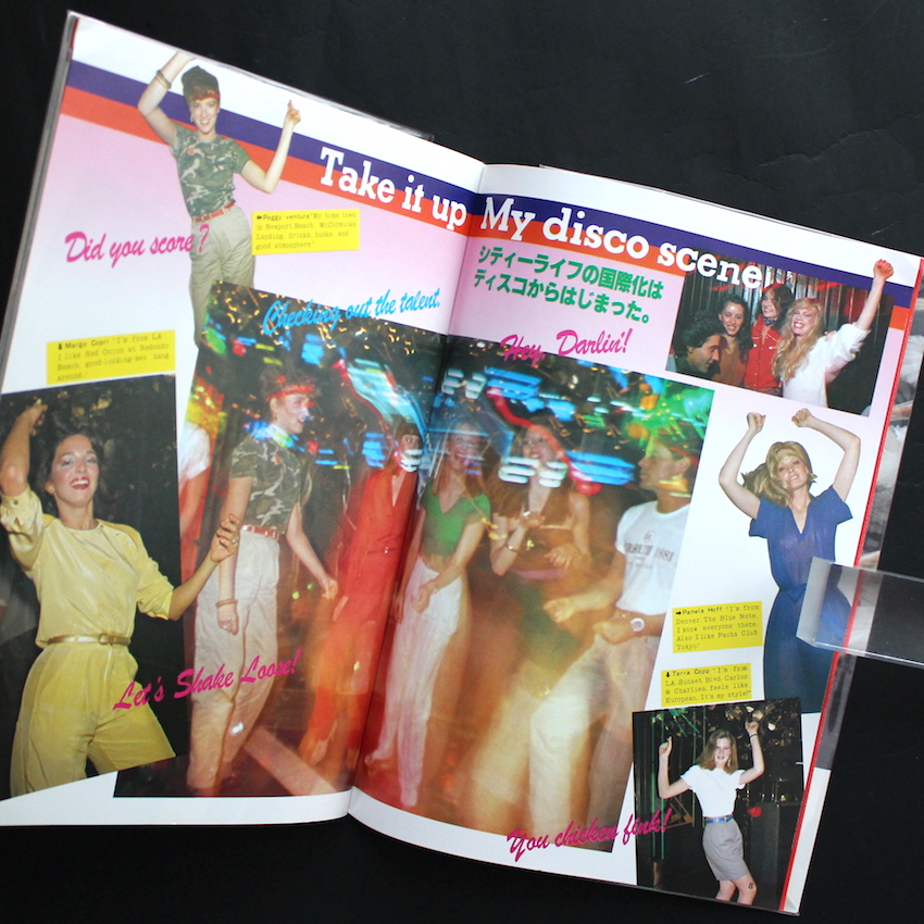 1981年に鎌倉書房から発行された『マイノート25 ディスコ』。“ディスコはいまいちばんセクシーな感情表現”というコピーが添えられた本書は、ダンス的な視点からディスコを紹介した指南本。ディスコ・ダンスの用語解説からステップの紹介を中心に、ファッションや音楽といったその周辺カルチャーも紹介しています。「DISCO FASHION」「DISCO MAKE」といった女性よりの内容が中心になっており、なかには「レオタードをTシャツ感覚」で着こなすといった時代を感じさせる記事も。そのほかには、アメリカのディスコ事情を紹介したものや全国のディスコを紹介するディスコ・ガイド、ディスコに来る人々のスタイルを「Funky」「Latin Tropical」「Punk」などで分類したディスコ・アイテム図鑑などを掲載。山口はるみ風のイラストもエイティーズな雰囲気を感じさせます。