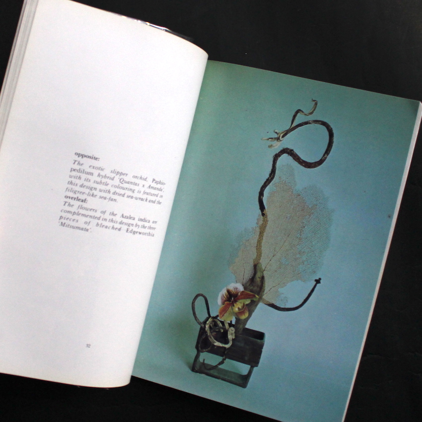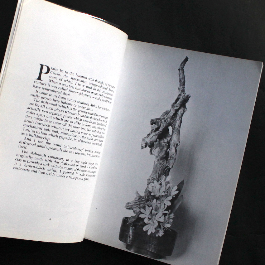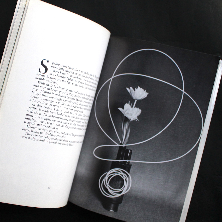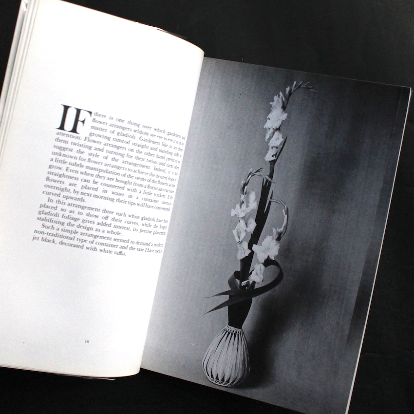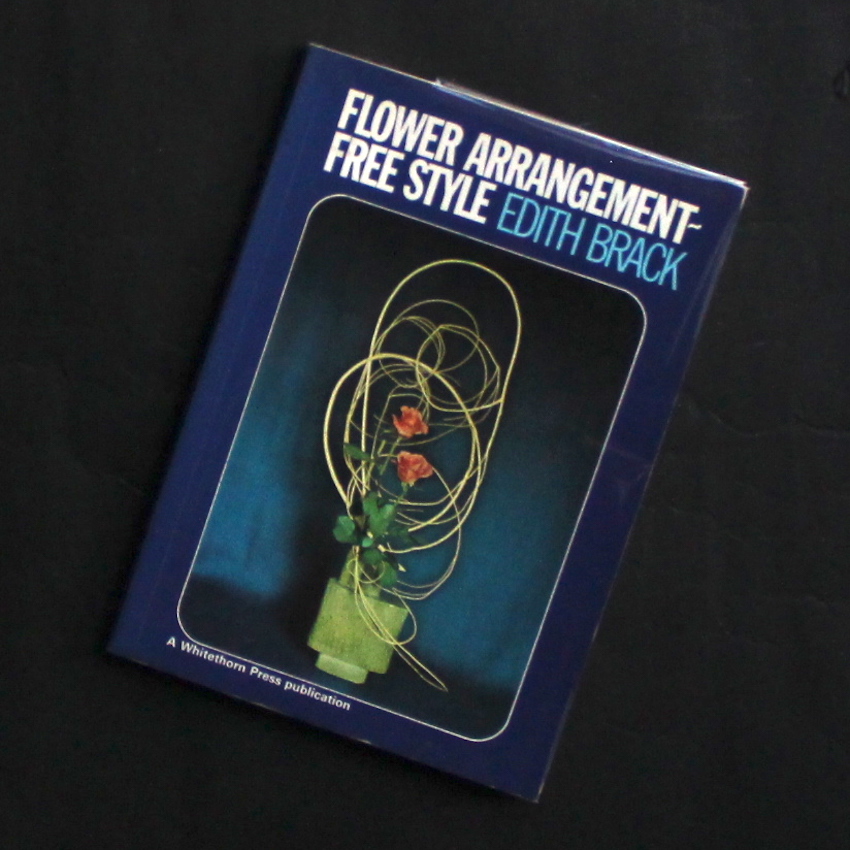 イギリスのフラワー・デザイナー(フラワーアレンジャー)であるエディス・ブラックの作品集『Flower Arrangement - Free Style』。イングランドの北西部ランカシャー生まれ、チェシャー育ち。6年以上日本のいけばなに学び、西洋の美に東洋の美のエッセンスが加えられた美しい創作に定評のあるデザイナーのようで、リバプールのフラワーアレンジメント・ソサエティーの創設者であり、これまでに『Modern Flower Arranging』(1982)『Women's Institute Guide to Arranging Flowers』(1988)『The Creative Guide to Flower Arrangin』(1992)など、フラワーアレンジメントに関する著書も多数刊行されています。こちらは70年代に上梓された作品集で、左ページにテキスト、右ページに図版が収録されています。図版は基本的にモノクロベースですが、所々に散りばめられたカラーの作品が美しく、本の良いアクセントにもなっています。