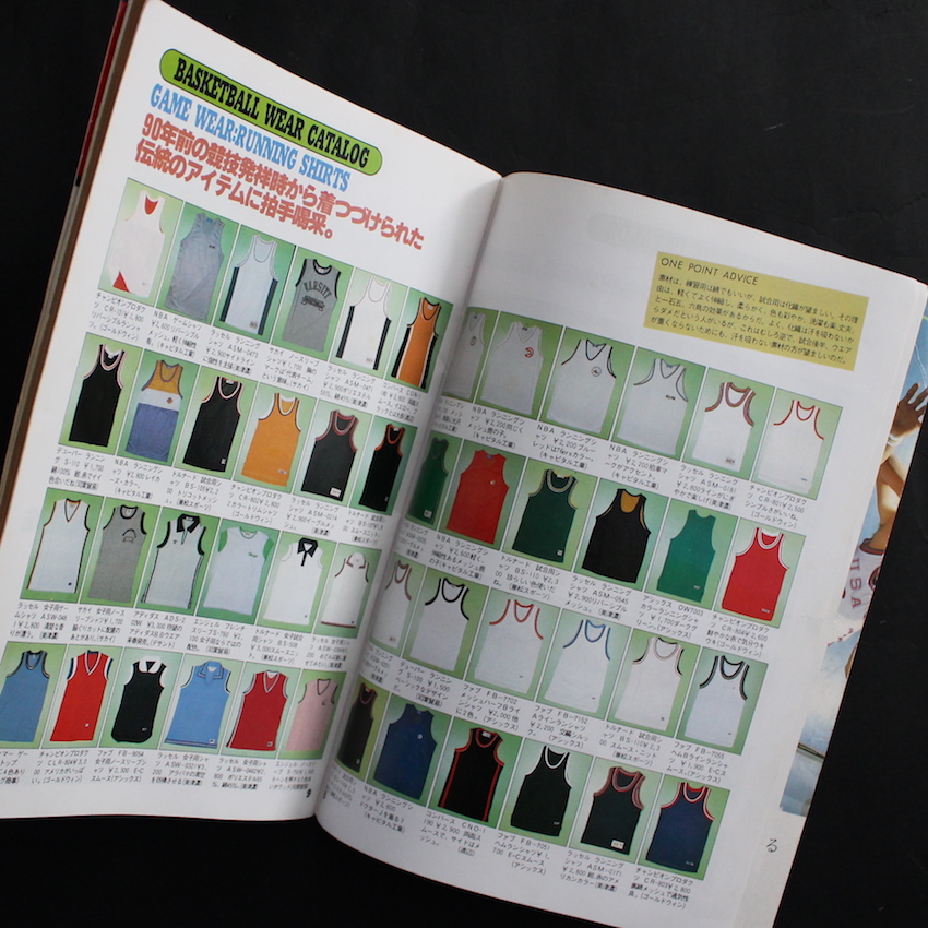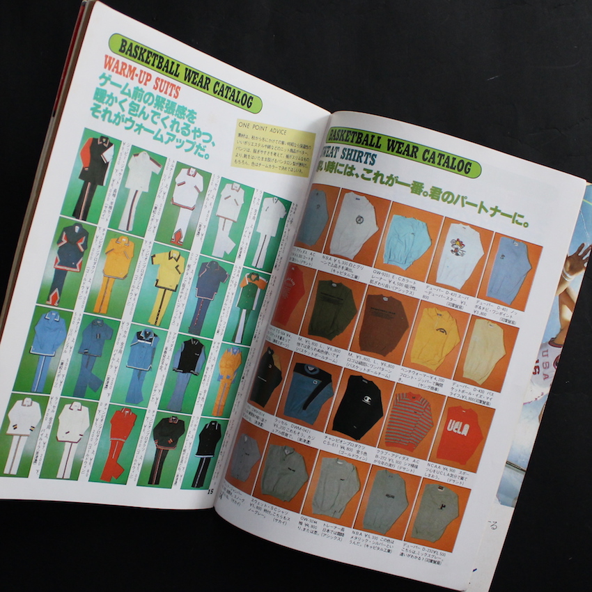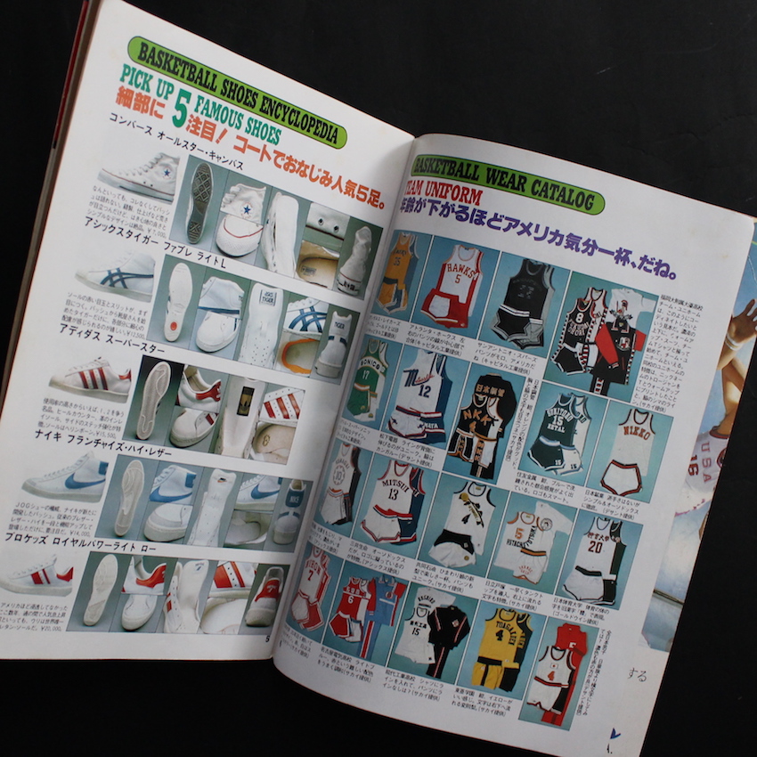 本書は、70年代から80年代にかけて多くのサブカル本を発行していた今はなき出版社・鎌倉書房による『スポーツ・ノート(Sports Notes)』の第36号「バスケットボール」。戦後の経済成長を背景に、ライフスタイルが充実し始めて余暇も生まれ、趣味にもお金をかけられる人が多くなってきた70年代~80年代の日本。そういったニーズを満たすべく、衣食住関連の様々な雑誌も生まれており、スポーツ・ノートは、主にスポーツ初心者向けのHow to 本として、50近い各種スポーツを紹介したムック本を刊行した他、増刊号・Special Issueもいくつか出しています。本書では、ユニフォームやシューズ、ウェアといったカタログから始まり、シュートやパスといった基礎的な技術から、ワンオンワンやチームプレーといった応用編の紹介、さらにはNBAのチームや選手紹介やちょっとした雑学など、バスケットに関する情報が凝縮された誌面を展開。『スポーツ・ノート』と言えば橘田幸雄によるイラストが目を引きますが、テキストにつけられた見出しも一癖あって楽しめます。