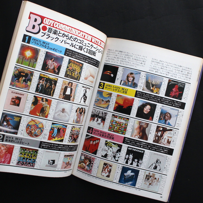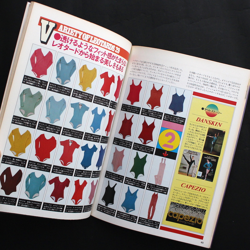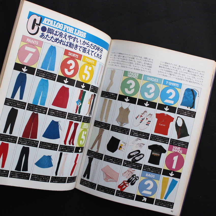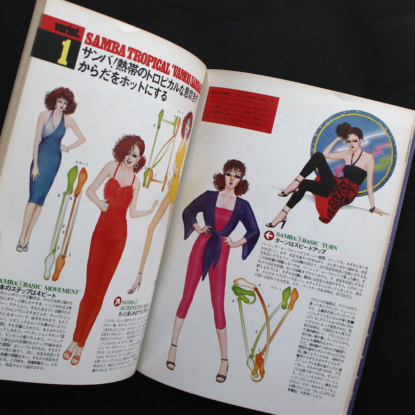 橘田幸雄によるイラストで古書好きにはおなじみの『スポーツ・ノート(Sports Notes)』でも知られる鎌倉書房から発行された80年代のニュータイプマガジン『マイノート1 フィットネス』。エンターテイメントな実用書としてシリーズ化していますが、本書はその1巻目です。女性の趣味的なコンテンツがこのシリーズの通例となっていますが、本書は音楽やダンスを組み合わせたエアロビクス的な視点からフィットネスを紹介しています。前半はウォーミングアップから基本的な動作がイラストでわかりやすく解説され、後半はよりダンサブルな内容に。サンバやジルバ、ロックンロールといったダンスをフィットネスと掛け合わせて紹介。「音楽はもう、第2の酸素と言いたい」という名文句から始まる、フィットネスの相棒である音楽紹介では、ディスコ&ソウルからロック、レゲエ、そしてクラフトワークまで踊れる音楽が並びます。そのほか、レオタードなどのウェアや食(フード)、美容アイテムの紹介など、女性の心を掴むコンテンツを収録。
