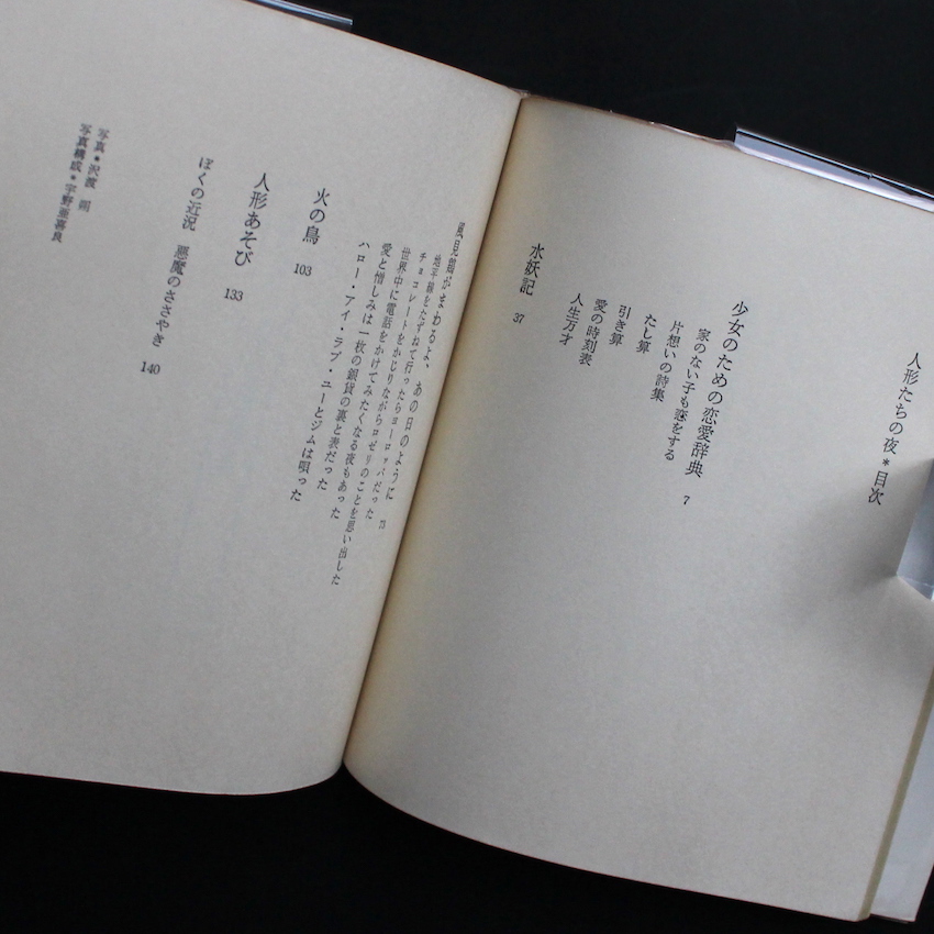 戦後日本を代表する前衛芸術家のひとりである寺山修司の作品集『人形たちの夜』。高校時代より俳句を、大学時代からは短歌を詠み、若くしてその才能を高く評価されていたという寺山修司。1960年前後よりラジオドラマや映画のシナリオ・戯曲で注目を集め、1960年代後半からは、アングラ四天王のひとつであった演劇グループ「天井桟敷」を横尾忠則らと共に創設。70年代には劇映画で国内外で公演を行い、47歳の若さでこの世を去りながらも、多くの分野で前衛的な作品を残したその功績の大きさにより、今もなお絶大なる支持を受け続けているアーティストです。本書は、70年代に新書館より刊行されていた文庫版「For Ladies」シリーズからの一冊で、寺山によるポエムが収録されているほか、冒頭の人形のポートレートは、沢渡朔が担当、また、本書のアートディレクションは宇野亜喜良が担当しています。