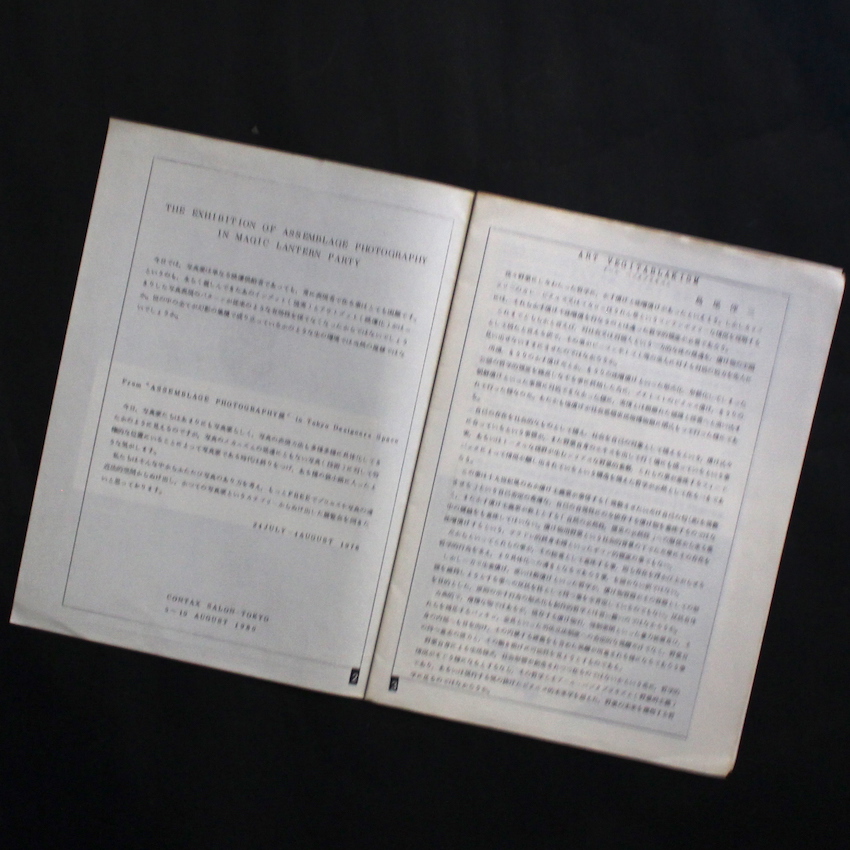 「アッサンブラージュ・フォトグラフィ / Assemblage Photography」とは、美術家・永井宏と、写真家・島尾伸三と谷口雅の3名によって、1978年に行われたエキシビジョンでした。本書は、その第2回展が原宿のコンタックス・サロンで行われた際に発行されたと思われるポートフォリオです。「写真による新たな可能性」を探求すべく、従来からの「記録」表現のみならず、「実験」表現にも積極的に取り組んでいます。この第2回展では、メンバーのスライド作品と作品展示が同時に行われ、その後はヴィデオのインスタレーションなども行なっており、80年代らしい「現代美術」的要素も積極的に取り入れられています。本展では、サポーターであった佐野寛の序文から始まり、島尾伸三、永井宏、大西みつぐ、川島敏生、梶洋哉、住友博、築地仁、平木収らメンバーのポートフォリオ、そして金子隆一のあとがき等が収録されています。