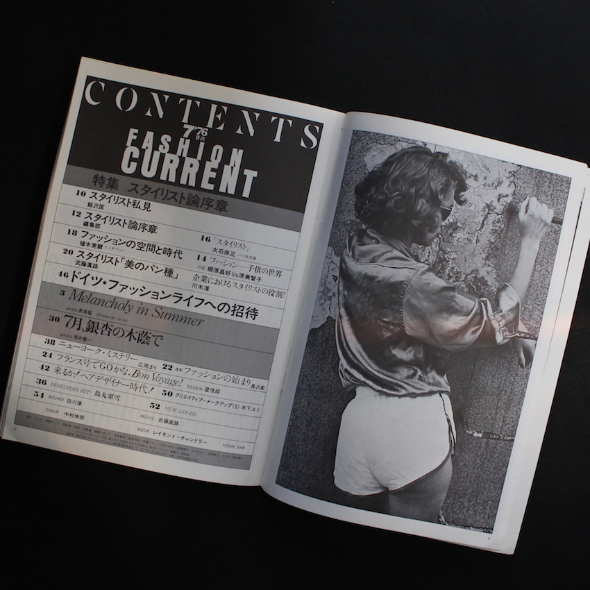 1970年代後半にかけて刊行されていたファッション情報誌『ファッションカレント / Fashion Current』。「型破りなファッション誌」を目指して、いわゆる「トレンド」や「コレクション」のみを紹介するような雑誌ではなく、「離婚」「子供革命」「ブス」など少し斜めの角度からファッションを見つめ、アーティスト、デザイナー、プロデューサー、ライター、エディター、そしてフォトグラファーなど多彩なゲストによるテキストや図版を交え、ユニークなレイアウトで構成されたサブカル的要素の強かったファッションカレント。本書は、巻頭に収録された写真家・長尾猛による「Melancholy in Summer」の図版が素晴らしく、その他世界的にも有名なインテリアデザイナー植木莞爾へのインタビューや、ピエール・カルダンのアシスタントも務めた鳥丸軍雪のテキストなども興味深い一冊です。
