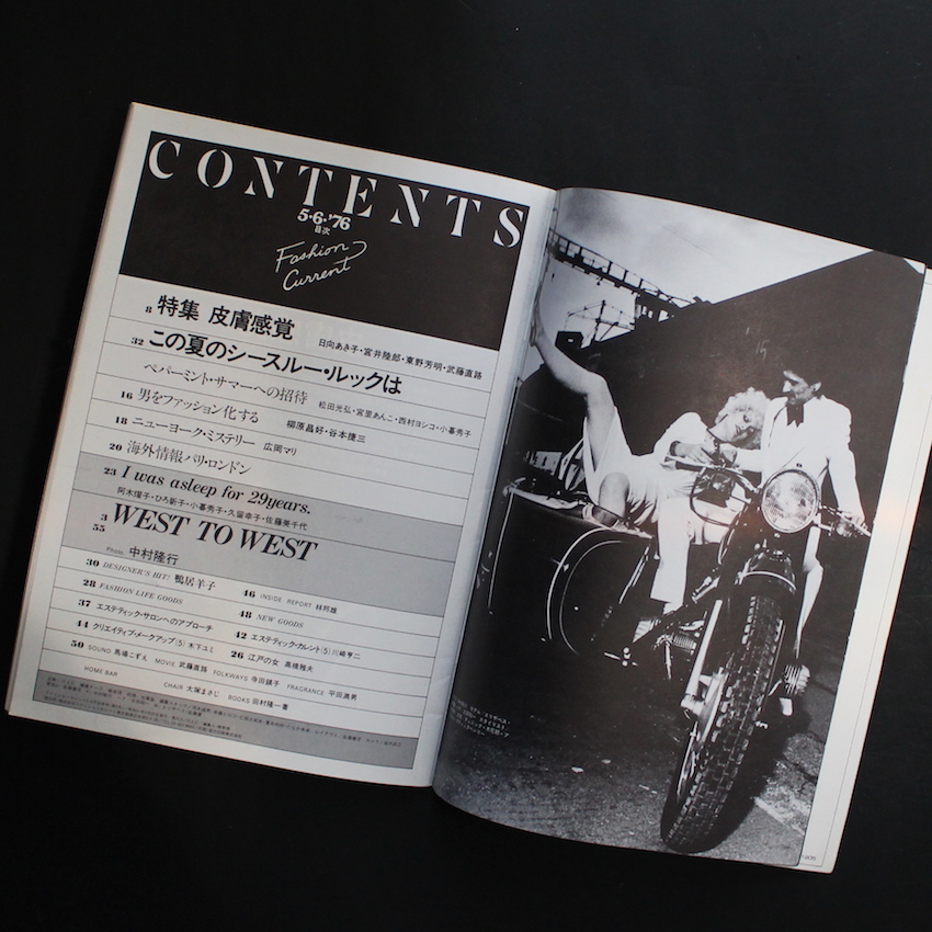 1970年代後半にかけて刊行されていたファッション情報誌『ファッションカレント / Fashion Current』。「型破りなファッション誌」を目指して、いわゆる「トレンド」や「コレクション」のみを紹介するような雑誌ではなく、「離婚」「子供革命」「ブス」など少し斜めの角度からファッションを見つめ、アーティスト、デザイナー、プロデューサー、ライター、エディター、そしてフォトグラファーなど多彩なゲストによるテキストや図版を交え、ユニークなレイアウトで構成されたサブカル的要素の強かったファッションカレント。本書は、巻頭・巻末に収録された写真家・中村隆之による「West to West」が素晴らしい作品。その他「特集 皮膚感覚(日向あき子・宮井睦郎・東野芳明・武藤直路)」「Designer's Hit!(鴨居羊子)」など、見応え・読み応えのあるコンテンツが収録されています。