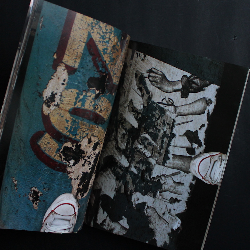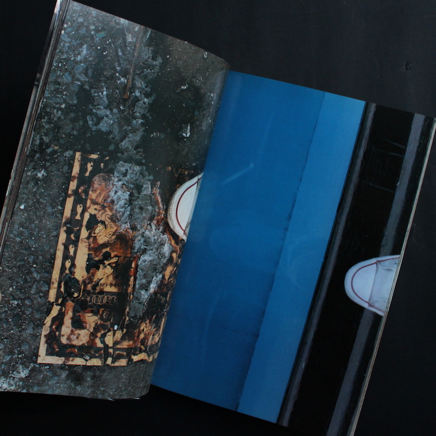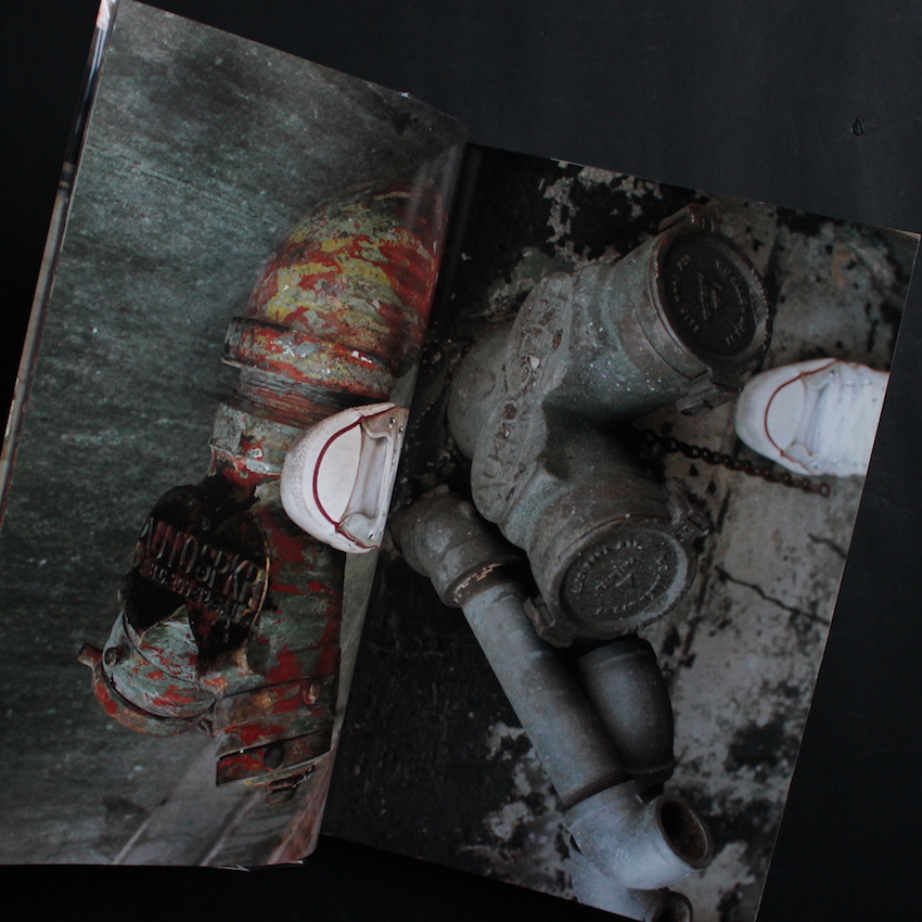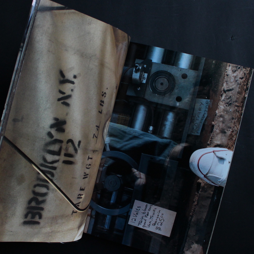 日本の現代美術家・折元立身の作品集『Step in Event Photograph』。1946年神奈川県川崎市生まれ、1969年に渡米してカリフォルニア芸術大学で学び、70年代初頭にはニューヨークに渡ってソーホーで暮らします。そこでビデオ・アートのパイオニアであるナム・ジュン・パイクと出会い、彼のアシスタントとなった縁で、国際的な前衛芸術運動フルクサスにも参加しています。70年代後半には帰国し、その後は顔一面にフランスパンを巻きつけた路上の人々と交流するパフォーマンス「パン人間」や、アルツハイマーの母親の介護を通じた「アート・ママ」などでも注目を集めました。こちらは、80年代にニューヨークを皮切りに世界各地をまわった折元が、その地と自身のスニーカーの足跡を写真に綴った一冊。何気ない、見過ごしてしまいそうな地面でも、その国独自の色彩や雰囲気を醸し出すとともに、自身のスニーカーには数々の思い出が刻まれたダイアリー。