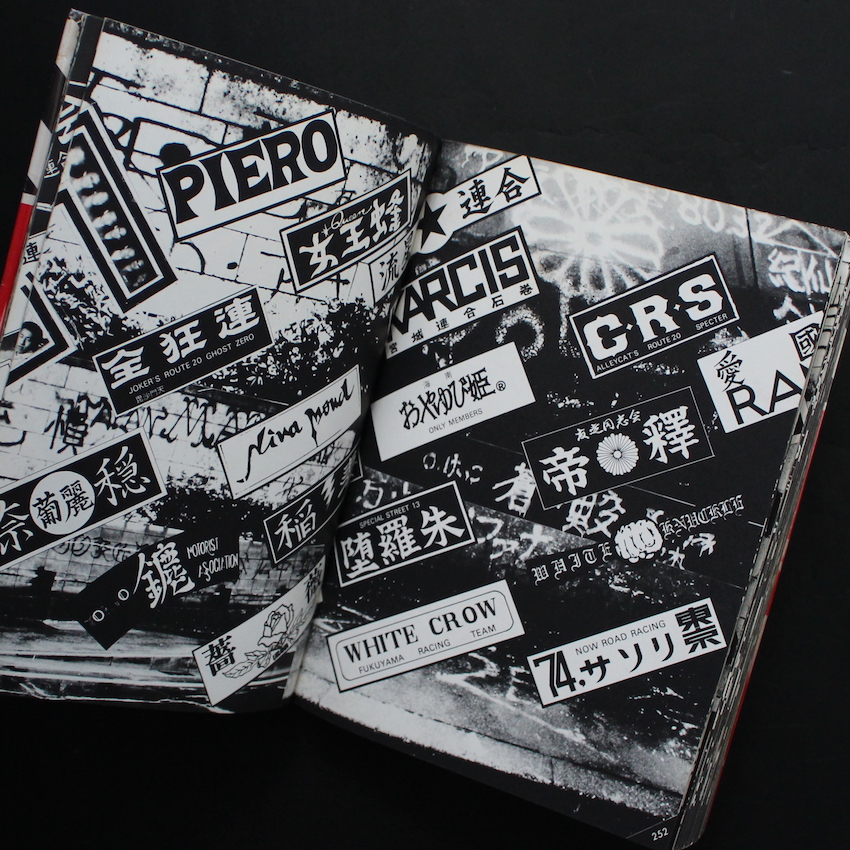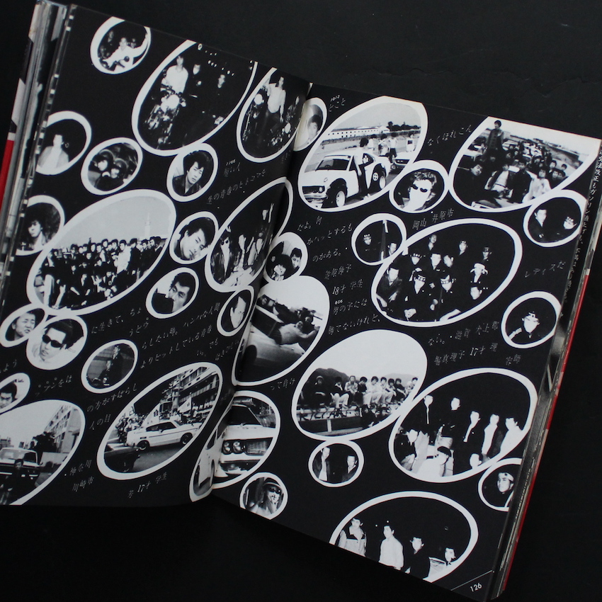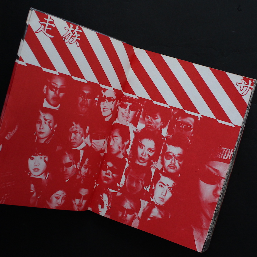 1980年前後に、第三書館より刊行されていた「暴走族」関連の作品集のひとつで国内外で人気の高い一冊です。写真のクレジットは、本書が刊行される6ヶ月前に写真集『Flash Up -Street PhotoRandom Tokyo1975-1979-』で壮絶デビューを果たした倉田精二のほか、守屋裕司、鍵和田良輔、長田勇市らの名が刻まれています。そして、編集担当は木村英輝で、この木村による奇抜なデザインと編集が、本書の個性を一層引き立たせています。木村は、60-70年代にロックフェスのプロデューサーなどを務め、日本にロックカルチャーの基礎を生み出した人物であり、そのカルチャーを表現した作品集『Too Much』(1970)をガリバーこと安土修三とのコラボで発刊しています。レッドを差し色に、イラストやコラージュなどを用いながら、斬新なデザイン及びレイアウトを試みており、暴走族の自由かつ奇抜なスピリットが強調されています。写真集というよりアートブック的要素の濃い一冊です。