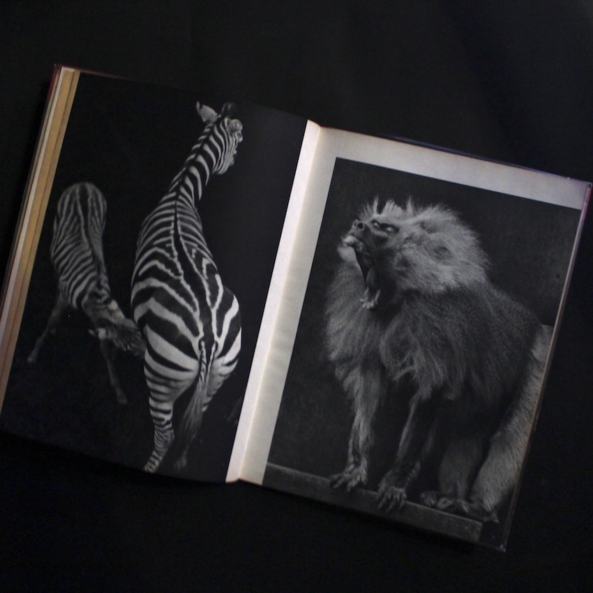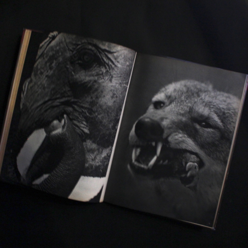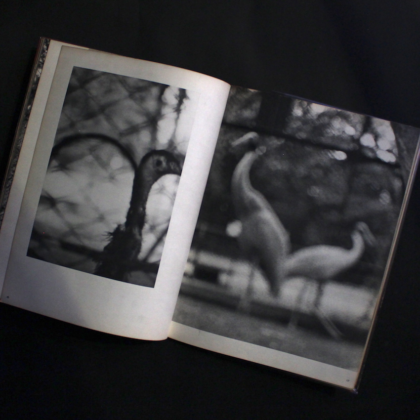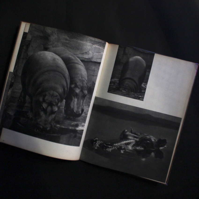 本書は、日本を代表する写真史家・金子隆一と、マンフレッド・ハイティングによる共著で、戦前戦後に刊行された日本の写真集の名作を紹介した作品集『The Japanese Photobook 1912–1990』(2017)でも紹介された一冊で、1950年代後半に創元社より刊行されたシリーズ写真集『現代日本写真全集』の第8号「動物作品集」編になります。表紙を飾るのは、細江英公による「パンダ」。その他、田中光常「とら」、吉江雅祥「しまうま」「まんとひひ」「ひくいどり」「くもざる」、長野重一「ぞう」「こよて」、田中徳太郎「しらさぎ」、渡部雄吉「だちょう」、田中光常「あしか」「しまふくろう」「ライオン」、周はじめ「とらふずく」「はしぶとがらす・のすり」、中村立行「ねこ」、山田広次「むくどり」、奈良原一高「えみゆう」「つる」、梶原高男「ブルドッグ・プードル」「バッグ」「グレートデン」、東松照明「チンパンジー」「のらいぬ」、織田浩「かば」、細江英公「うみがめ」「ペンギン」「サーヴァルキャット」、大橋治三「ねこ」など。小冊子付属。