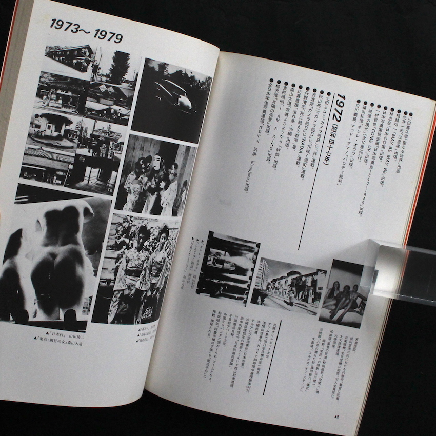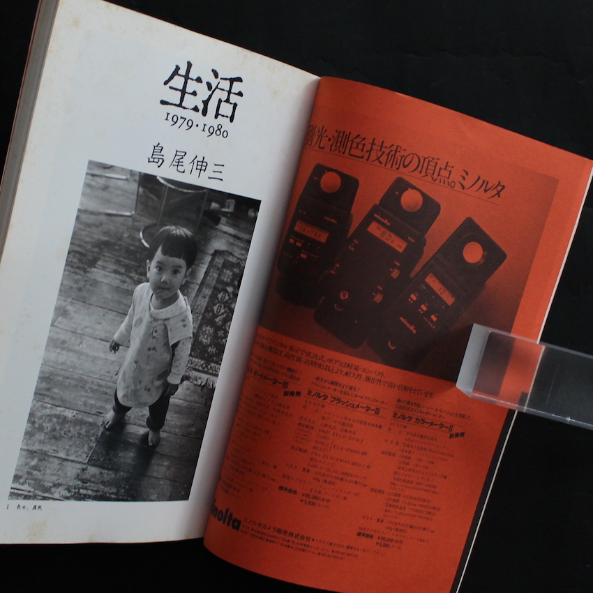 本書は、1980年代に刊行された写真(批評)誌『写真装置』の全12巻の記念すべき第1号『写真装置 #1 戦後写真の転換』。発行人は大島洋。『三閉伊』『幸運の町』といった写真集も刊行しているフォトグラファー。写真に関わる「批評誌」は、70年代に『写真批評』が刊行されたり、80年前後には金子隆一・築地仁らによるcameraworksも発刊していましたが、毎号100~208ページ近くの評論やインタビューを収録して、かつ写真図版も掲載していたコンテンツの質量も考慮すれば、『写真装置』の取り組みは秀でたものでした。「写真家自身による写真家のための写真誌」とも言える写真専門誌です。毎号、巻頭には20ページ前後の写真家の特集による図版が収録されており、本号は、島尾伸三による「生活 1979 1980」を収録。妻の潮田登久子や若かりししまおまほも登場。その他、石内都・原芳市・島尾伸三の座談会なども掲載されています。表紙はご存知の通り、荒木経惟の『センチメンタルな旅』より。