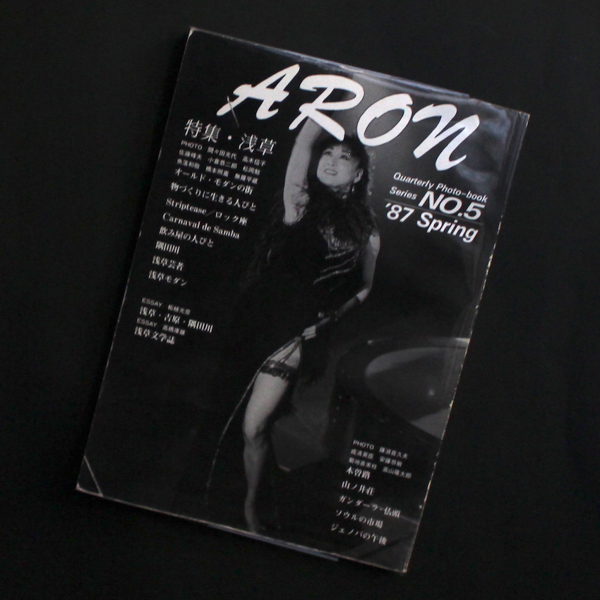 1980年代半ばから後半にかけて刊行されていた季刊写真誌『Aron』の第5号。発行はアロン書房で、アロン書房と言えば、橋本照嵩が1974年にのら社より上梓した名著『瞽女 / Blind Itinerant Female Musician』の復刻版を1988年に発行した版元で、本写真誌でも橋本を始め、数名の写真家の作品が収録されています。本号は「浅草」特集で、間々田光代・佐藤峰夫・高木信子による「オールド・モダンの街」、高木信子・小倉恭二郎・間々田光代による「物づくりに生きる人々」、松岡勉「Striptease / ロック座」、佐藤峰夫「Carnaval de Samba」、小倉恭二郎「飲み屋の人びと」、無羅平蔵・間々田光代・佐藤峰夫による「羽子板市」、魚落和敬「隅田川」、橋本照嵩「浅草芸者」、無羅平蔵「浅草モダン」、藤波喜久夫「木曽路」、成清英臣「山ノ井荘」、安藤恭敬「ガンダーラ・仏頭」、菊池喜美枝「ソウルの市場」、高山隆太郎「ジェノバの午後」など。さらにはエッセイとして、柘植光彦「浅草・吉原・隅田川」、高橋康雄「浅草文学誌」も掲載されています。