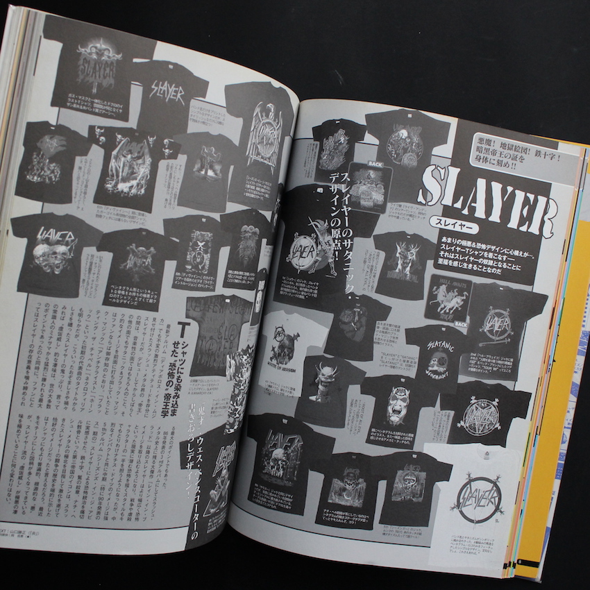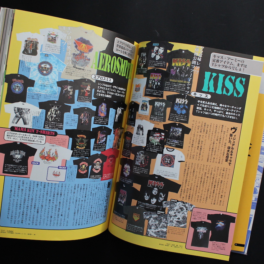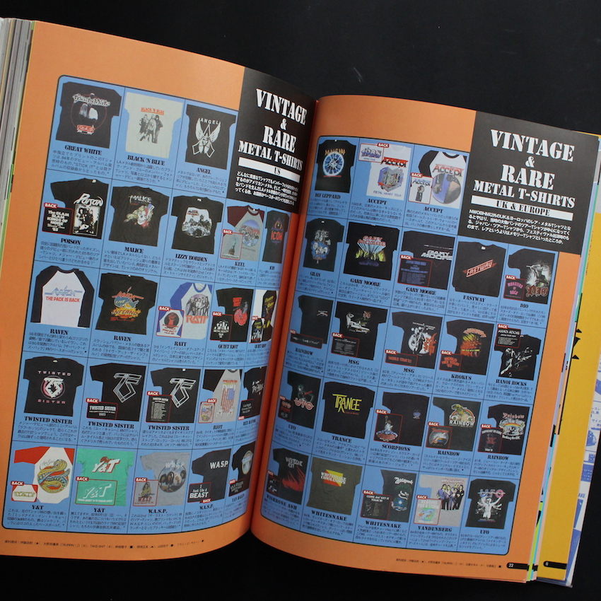 本書は、シンコー・ミュージックが1998年に刊行したムック本で「ロックTシャツ」にフォーカスした貴重な一冊。古着屋さんでも、アーティストやデザインによっては希少品として人気が高い「ロックTシャツ」ですが、本書では、「ヘヴィ・メタル、ハード・ロックTシャツ」「パンク・ロックTシャツ」「アザー・ロックTシャツ」のカテゴリーに分けられ、さらにアーティストごとに今までに販売されたTシャツがカラー・モノクロで収録されています。「メタリカ」「アイアン・メイデン」「オジー・オズボーン」「キッス」「エアロスミス」「ボンジョヴィ」「スキッド・ロウ」「ヴァン・ヘイレン」「ディープ・パープル」などから、「ニルヴァーナ」「レッド・ホッド・チリ・ペッパーズ」「ビースティ・ボーイズ」「パール・ジャム」「ソニック・ユース」などのバンド、さらには「70年代UKパンク」「80年代USパンク」まで、見どころ満載のムック本です。