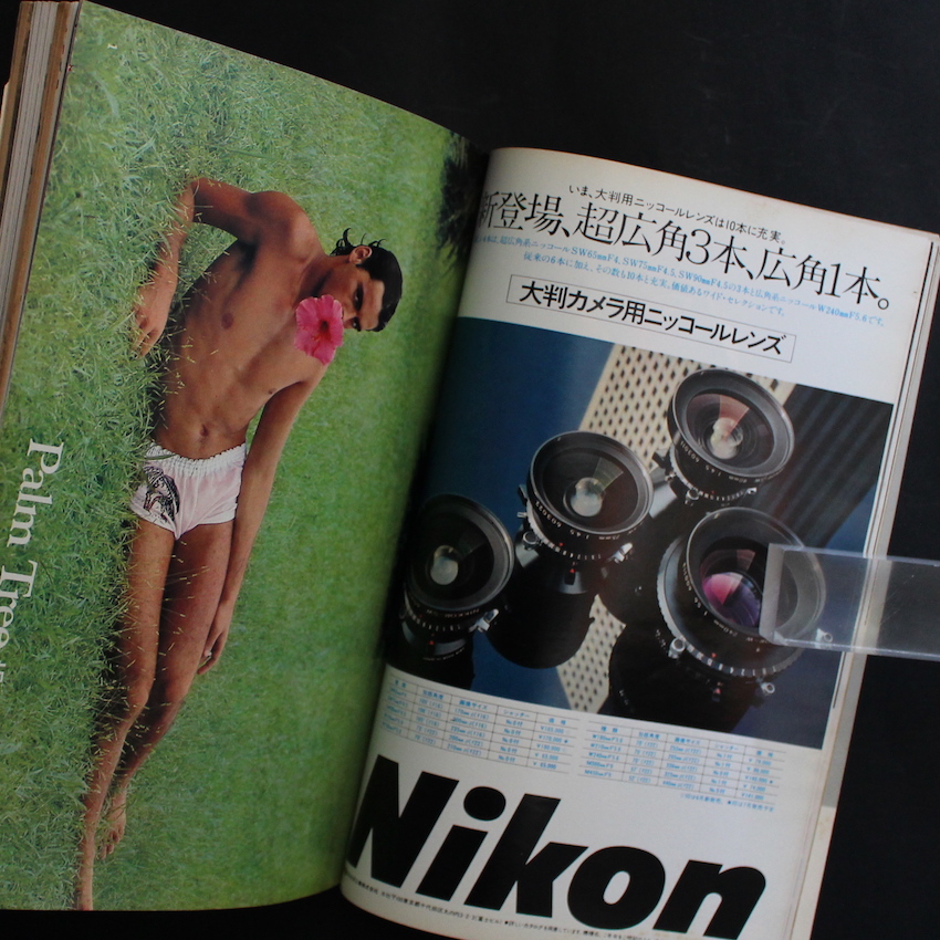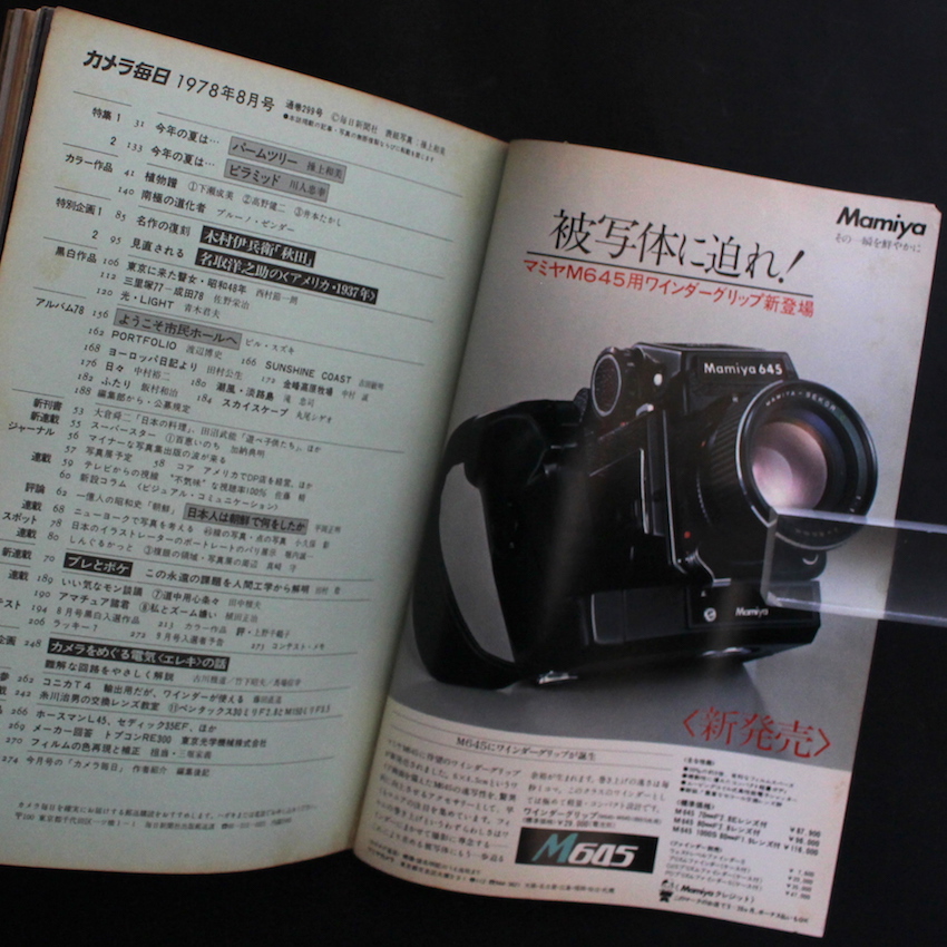 写真雑誌『カメラ毎日 1978年8月号 / Camera Mainichi August 1978』。同年のカメラ毎日は、当月のカバー写真を担当した写真家が、巻頭の特集ページを担当しており、本号は著名人のポートレート作品などでも名を馳せた操上和美による「今年の夏は・・・ パームツリー」から始まります。また、その後に続く川人忠幸による「今年の夏は・・・ ピラミッド」も見応えがあります。その他の収録作品は、木村伊兵衛「秋田」、名取洋之助「アメリカ 1937年」、西村節一朗「東京に来た瞽女・昭和48年」、佐野栄治「三里塚77 - 成田78」、青木君夫「光・LIGHT」。その他、「アルバム'78」からは、ビル・スズキ「ようこそ市民ホールへ」、渡辺博史「PORTFOLIO」、古田敏明「SUNSHINE COAST」、田村公生「ヨーロッパ日記より」、中村誠「金蜂高原牧場」、中村裕二「日々」、滝忠司「潮風・淡路島」、飯村和治「ふたり」、丸尾シゲオ「スカイスケープ」など。