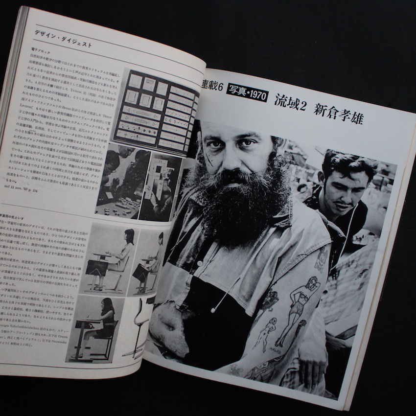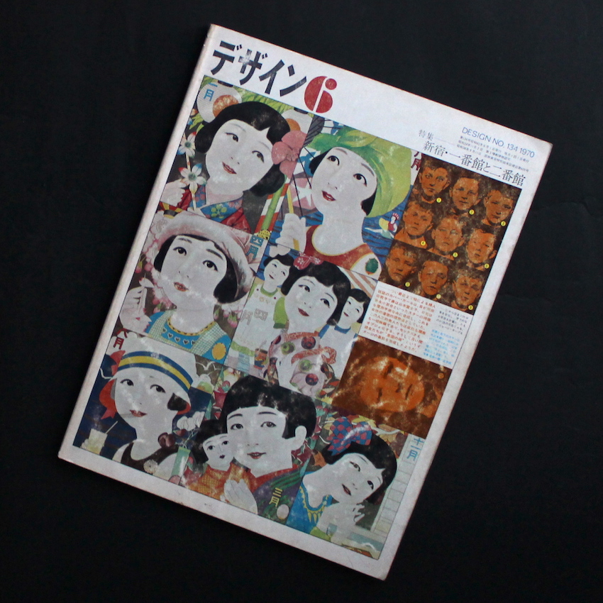 美術出版社より刊行されていた雑誌『デザイン』の1970年6月号で通巻134号。この年は森山大道・中平卓馬・新倉孝雄による写真連載が組まれており、本号はその新倉孝雄による「写真・1970(流域2)」が収録されています。その他、「デザイン・アスペクト(森啓・神田昭夫・有馬宏明・宮脇昭彦・中平卓馬・根岸順・藤本和子)」「特集=新宿・一番館と二番館」「早川良雄の作品」「永井一正の作品」「ビートルズ・イラスト集」「デザイン・ダイジェスト(石渡日佐夫)」「江戸のデザイン(草森紳一)」「変身する建築 環境の原像3(多木浩二)」など。