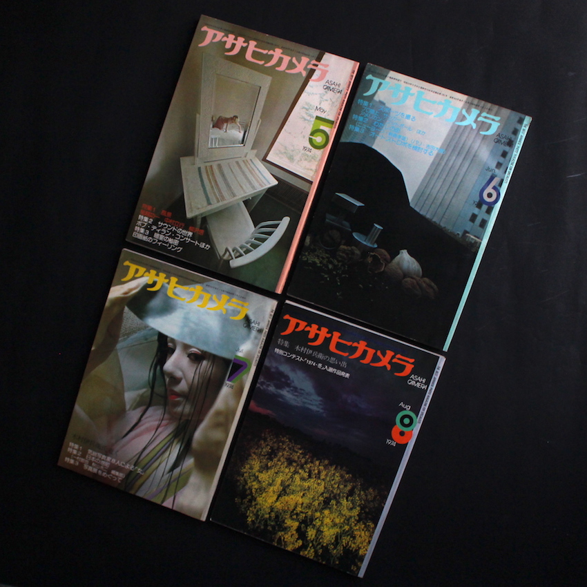写真雑誌『アサヒカメラ1974年・全12号 + 増刊号1冊』。1971年から続いた木村伊兵衛の大連載「街角で」が、74年5月の木村の死去により、全32回で終わりを告げました。一方、本年1月号より始まり、以降3年半に渡り続き、第1回木村伊兵衛写真賞の授与も受けた、北井一夫による「村へ」の連載も毎号収録されています。また、4月号の増刊として刊行された「現代の写真'74」が、当時の写真の潮流をまとめたような内容となっており、荒木経惟の「過去の女たち」、深瀬昌久の『家族』そして『父の記憶』の序章ともいえる「あるばむ」、東松照明の「太陽の鉛筆」、森山大道の「秋田行」、立木義浩「California I Love You」、沢渡朔「少女アリス 森の人形館 NADIA」、十文字美信「Human Society」などが掲載されています。