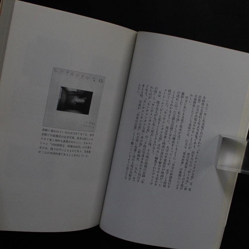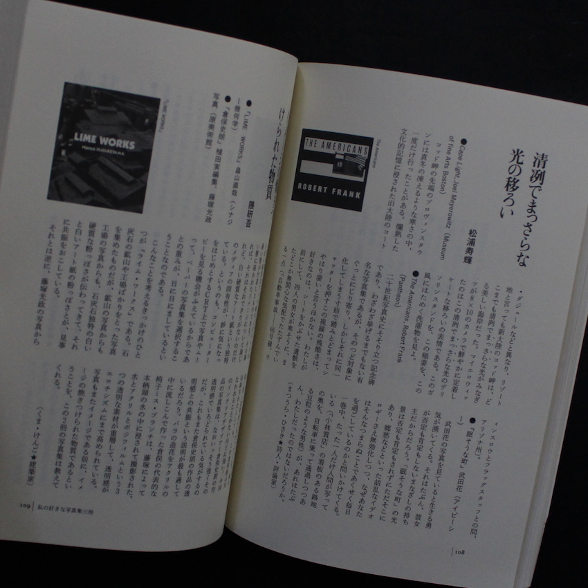 季刊誌「リテレール」の第16号で、特集「写真集を読む」。本号の最大の魅力は、荒木経惟の処女作『センチメンタルな旅』に収録された全109の写真図版の複写が収録されており、さらにその1ページ毎に写真評論家である飯沢耕太郎が、キャプションのごとく解説を加えているところです。「私写真の幕開け」「プライベート・ムービー」「写真と映画の融合」など、多くの賛辞・賛否を受けた荒木の初期代表作について、どのような意図で撮影がなされ、どのような意図でこのレイアウトが組まれ、その奥にはどんな意味が込められているのか、など「写真集を読む」という意味では大変勉強になる内容です。その他港千尋による「The Pencil of Nature」(ウィリアム・H・フォックス・タルボット)に関する批評、鈴村和成によるイリナ・イオネスコへのインタビュー、さらには隈研吾・桐野夏生・堀江敏幸・小谷真理・津田基らが「私の好きな写真集三冊」を紹介しています。