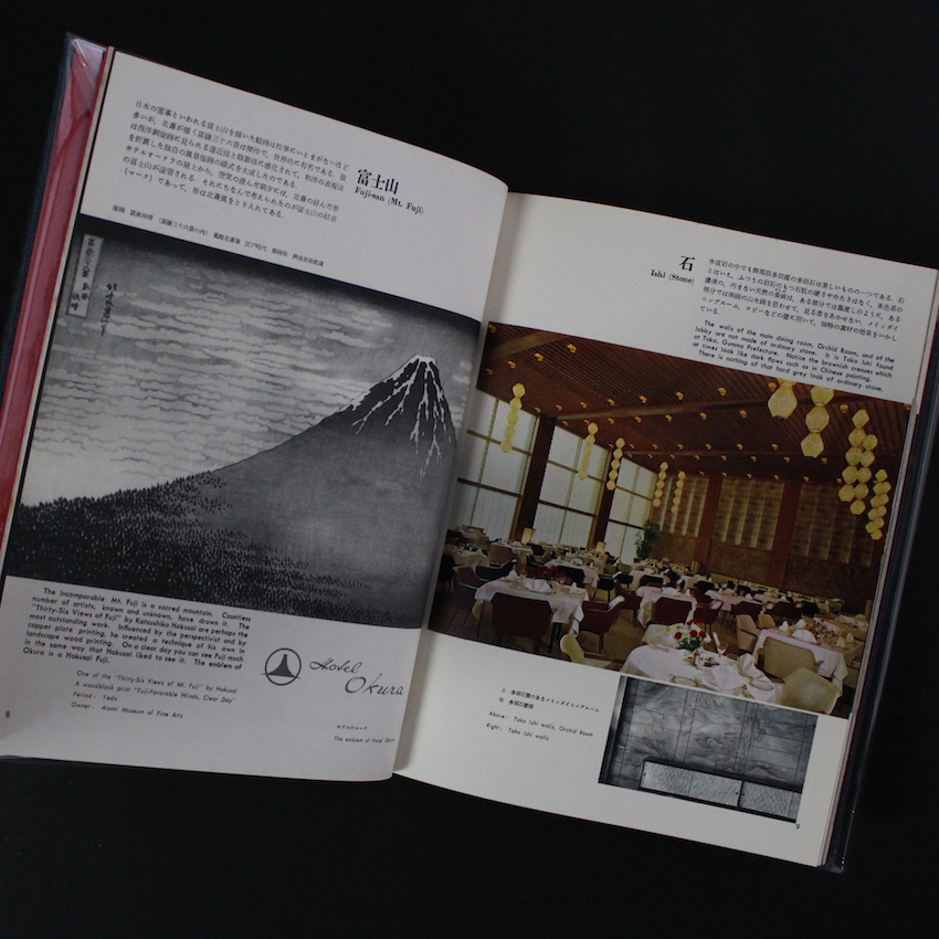 2015年8月末日をもってリニューアルのため惜しまれつつも閉館を迎えたホテル・オークラ。「日本美術の粋を極めた日本ならではの国際的なホテル」というコンセプトの下に産声を上げたのが1962年。谷口吉郎、小坂秀雄を中心とした設計委員会によるモダニズム建築。溝口三郎、繁岡鑒一らを中心とした意匠委員会による日本の伝統美を纏った意匠・装飾。海外の要人や有名アーティストの常宿としても知られ、トラディショナルな要素と現代にも通じるモダンなデザインは世界各国から高い評価を受け続けてきました。本書は、オークラ開業の2年後の1964年に、東京オリンピック開催をふまえて、ホテルの日本的意匠及び日本の古美術のもつ魅力を広く紹介することを目的に刊行されたホテル・オークラの作品集・写真集。「日本の自然」「日本の建築」「日本の文様」「各国の意匠」の4部構成で編集されており、オークラの意匠とそれに関係のある古典美術や日本の風物が詳細に描写されています。英語併記。