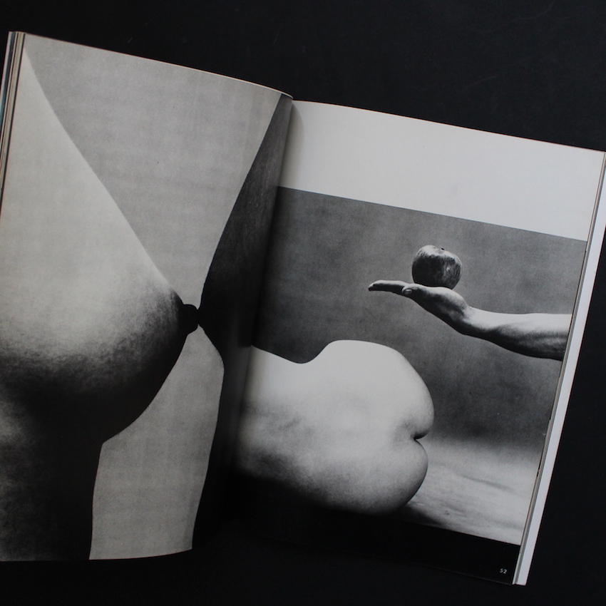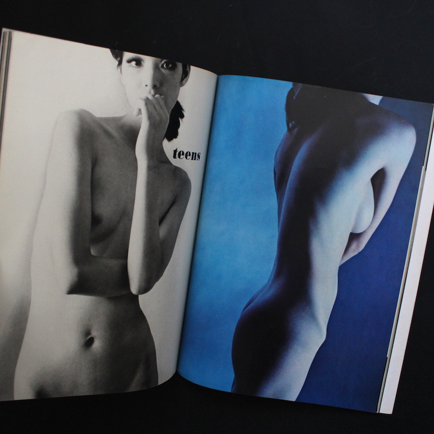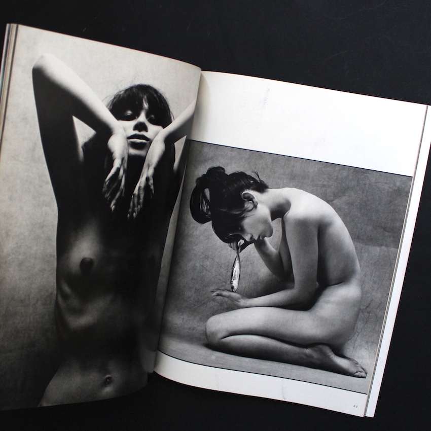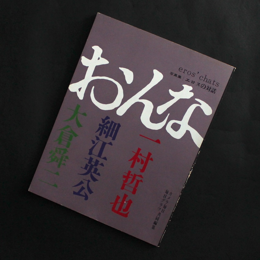 本書は、『カメラ毎日』及び『毎日グラフ』の共同編集で、1969年に毎日新聞社より刊行された写真集『おんな エロスの対話 / eros' chats』。当時は、60年代の写真界に旋風を巻き起こした仕掛人・山岸章二が、カメラ毎日の実質的編集長として活躍していた時代であり、記載はありませんが、おそらくはこちらも山岸の企画と編集でまとめられたと思われる一冊です。テーマは「おんな」と「エロス」。そして、参加アーティストは、『サロメ』などの代表作で知られるヌードの達人・一村哲也。処女作『おとこと女』そして『薔薇刑』『鎌鼬』と60年代に数々の名作を打ち出した巨匠・細江英公。そして同時代にファッション・コマーシャルな世界で活躍した大倉舜二の3名。素晴らしい作品の数々です。