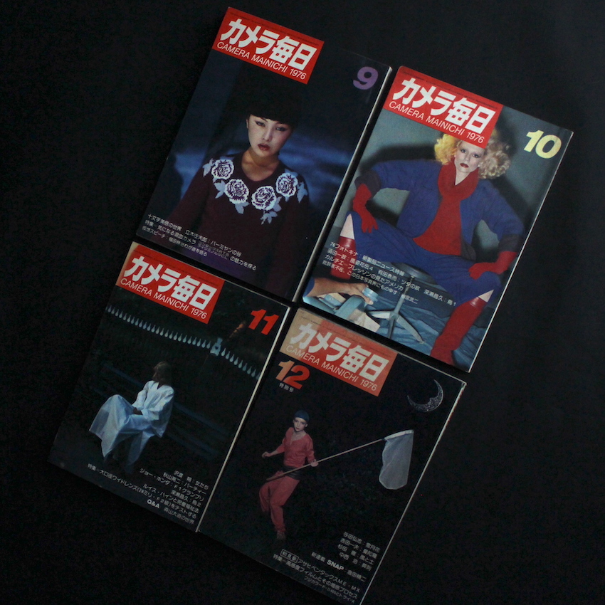 写真雑誌『カメラ毎日』の1976年度・12冊セット。60年代から、立木義浩や篠山紀信といった若手コマーシャル写真家を積極的に誌面に取り上げ、高梨豊・森山大道らプロヴォークメンバーの作品もいち早く紹介した、カメラ毎日の編集長・山岸章二。実質的にリーダーとして編集を担っていながらも、「編集長」と正式にその名が刻まれているのは、76年度〜78年度の半ばまで。この「編集長・山岸章二」の期間に、本誌で紹介された貴重な作品が「深瀬昌久・烏」。70年代初頭からも、断片的に「カラス」をモチーフにした写真は発表していたものの、タイトル「烏」を冠して発表を始めたのは、1976年10月号及び11月号のカメラ毎日から。その後、78年は「烏〈3〉暁の金沢・石川門」(1月号)、「烏〈4〉」(6月号)と続いていき(ここまでの計4回が編集長・山岸章二)、最終的には1982年10月号の「烏 - 終章」と合計8回を数えました。現在では『鴉 / Ravens』の復刻版も出版され、世界的にも高い人気を誇っていますが、その始まりが1976年度のカメラ毎日です。そのほか、3月号では清家冨夫の初期作品「Landscape」も収録されるなど、貴重な70年代半ばの作品が詰まっています。