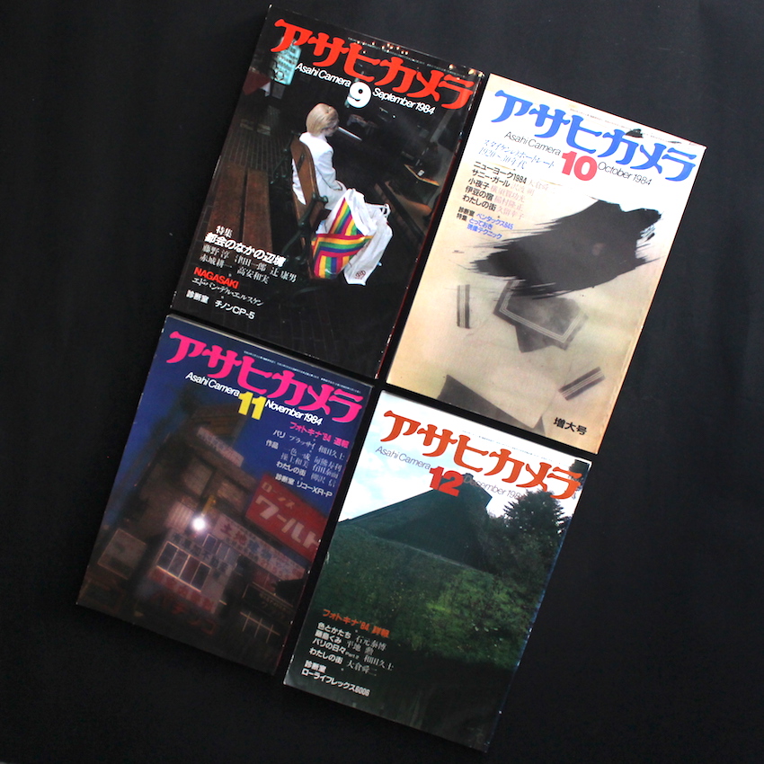 写真雑誌『アサヒカメラ 1984年・全12号 / Asahi Camera All 12 issues 1984』。各号の特集は、1月号「女(細谷秀樹・沢渡朔・一村哲也ら)」、2月号「風景・午後の光(操上和美・竹内敏信・柳沢信ら)」、3月号「若者のドキュメント(橋口譲二・樋口一成・佐藤和孝・鷲尾倫夫ら)」、4月号「都市の顔(和田久士・野火重本・翁長裕・高安和実ら)」、5月号「ポートレート(高橋昇・比嘉康雄・英隆・橋本照嵩ら)」、6月号「ネイチャーフォト(本多真ら)」、7月号「まちの風情(田沼武能・秋山亮二・本橋成一・百々俊二ら)」、8月号「アマチュアNOW」、9月号「都会のなかの辺境(藤野淳・津田一郎・辻康男・赤城耕一・高安和実ら)」、10月号以降は特集はなく、「小夜子」(横須賀功光)、「色とかたち」(石元泰博)などが収録されています。