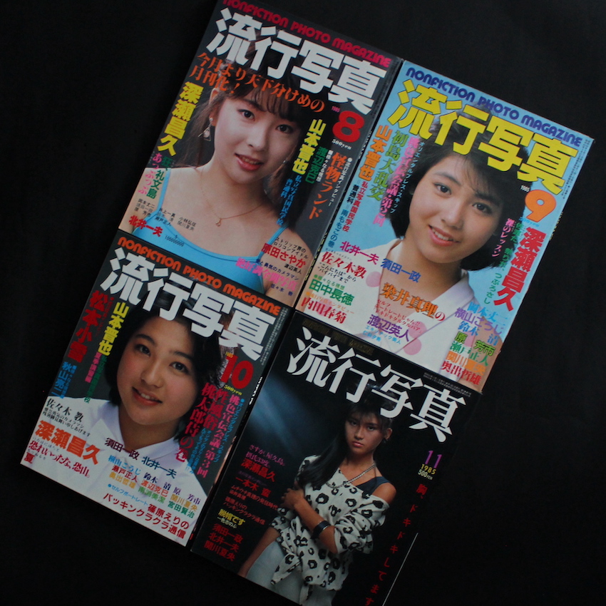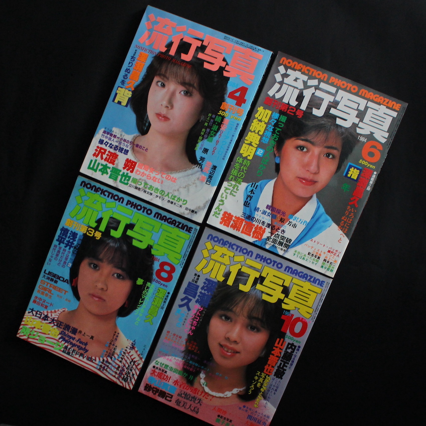1984年から85年にかけて刊行されていた写真雑誌『流行写真』の全13号+流行計画1冊=計14冊セット。戦後の写真界を牽引してきた新聞社のカメラ雑誌が勢いを失い、カメラ毎日は1985年に休刊。一方で、1981年に白夜書房から刊行され、編集長・末井昭と写真家・荒木経惟によるコラボを中心とした『写真時代』が爆発的な人気を誇った80年代。カメラ誌では取り上げられない「エロス」と「フツーの写真」の構成が、男性を中心に熱心な読者層を捉え、『写真時代』と類似した雑誌も生まれました。本書もそのひとつで、深瀬昌久の「いろはにほへと」「ちりぬるを」の連載シリーズをメインとして、その他渡辺克巳の「Outlow」や、原芳市の「曼陀羅図鑑」、さらには深瀬に師事した瀬戸正人らの作品が誌面を賑わせていました。また、北井一夫や尾仲浩二らの珍しいポートレートやヌードなども収録されていたり、各号の背表紙をつなぎ合わせると女性のヌードが現れるようなデザインなども面白いです。深瀬ファン必見のシリーズ雑誌です。流行写真の後継で「流行写真の総集編」と題された「流行計画」1冊付属します。