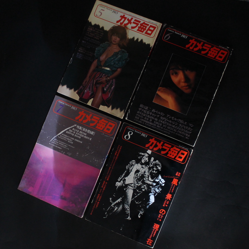 写真雑誌『カメラ毎日』の1983年・全12号セット。60年代の半ば頃から、実質的編集長・山岸章二により、有名無名問わず多くの写真家が取り上げられ、圧倒的な人気を誇ったカメラ毎日でしたが、徐々に山岸離れが進んだ70年代前半、そして山岸がカメラ毎日を去った70年代後半からは、勢いを失いつつありました。しかし、雑誌『写真時代』などの人気で、再び日の目を浴び始めた写真家らの力もあり、ユニークな作品が多数取り上げられるようになった80年代前半のカメラ毎日がこちら。12月号は、現在世界的に再評価が進む深瀬昌久による超大型ポラロイドで撮影された図版であったり、70年代後半より台頭してきた石内都が「Tokyo Bay City」というカラー・ランドスケープの連載を持ったり、写真時代で全盛を放った荒木が「写真私情主義」という連載を行なったり、復活を遂げた森山が所々に収録されたりと、見どころが充実したシリーズです。