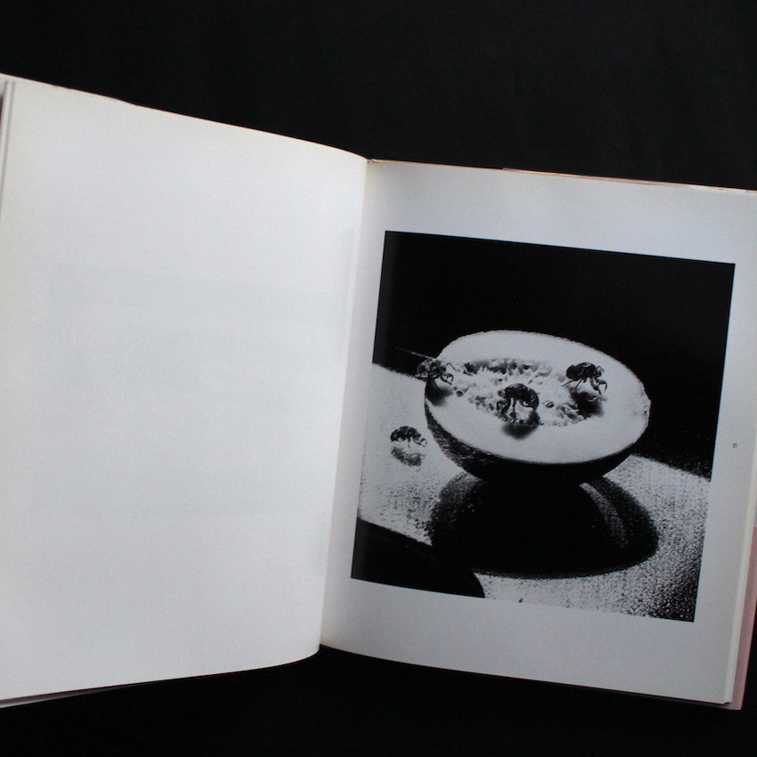 日本の女性写真家・今道子の写真集『EAT(Second Edition, With OBI)』。写真家曰く「歯ざわり、手ざわり、耳ざわり、目ざわりに肌ざわりと人体の感覚すべてを使って私は表現したいと思いますし、感じていただきたい。『EAT』シリーズは一種のレストランの触覚・感覚メニューかもしれません」という作品集。食材・昆虫・植物等を素材として独自の世界観で創作されたオブジェで有名な今道子の初期作品集にして木村伊兵衛賞受賞作品。「金魚とイクラと歯ブラシ」「野菜とパンティストッキング」「こはだのブラジャー」「キャベツ氏と息子」「鰯と安全ピン」など一見難解なタイトルの中に見る強烈なスティル・ライフ。「魚を撮ることにより生物への贖罪や永遠性を求め、『魚をモノ化』することで、再生を望んだり。。。」「生」「死」「肉体」「時間」等の交錯を通じて表現された奇妙で感性をくすぐられる幻想的な新世界。第2版・ハードカバー。帯付。