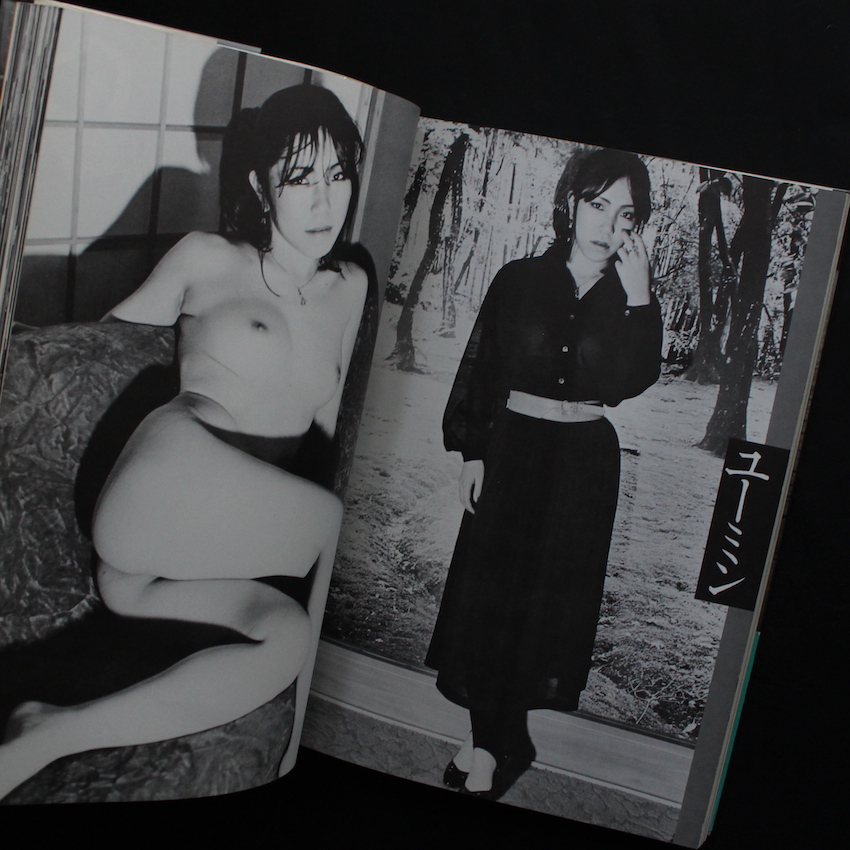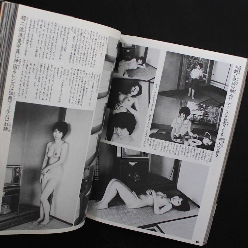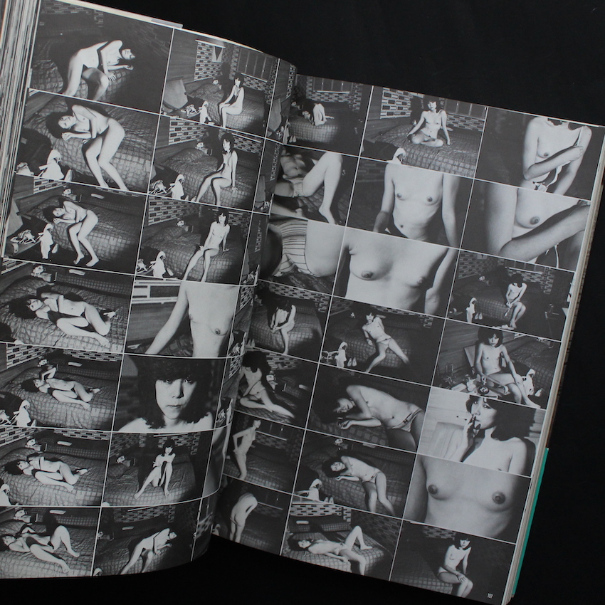 日本を代表する写真家荒木経惟の写真集『センチメンタル エロロマン 恋人たち(With OBI)』。下駄職人でありアマチュア・カメラマンであった父の影響を受けて写真を始め、70年代より「おー日本」「センチメンタルな旅」など現在まで語り継がれるセンセーショナルな作品を発表、過激なヌードや人情味に溢れたスナップは世界の写真ファンを虜にし、現在までに500冊もの写真集を刊行している偉大なる写真家・荒木経惟。本書は『ウィークエンド・スーパー』『ヘヴィ・スキャンダル』『ヘッド・ロック』といったサブカル雑誌で掲載されたものをまとめた1冊で、本書の本文レイアウトにもクレジットされている『ウィークエンド〜』の創刊者でもある、編集者の末井昭が担当していた企画だと思われます。これらの連載で撮り下ろしてきた45名超の女性たち。あどけなさの残る子から水商売の子まで、個性は様々ですが、荒木がとてもいい表情を引き出しているのは表紙からも分かります。一人ひとりにルポのようなテキストも付属しており、荒木×末井のタッグによるサブカル感の強い1冊。イラストで赤塚不二夫も参加。帯付。