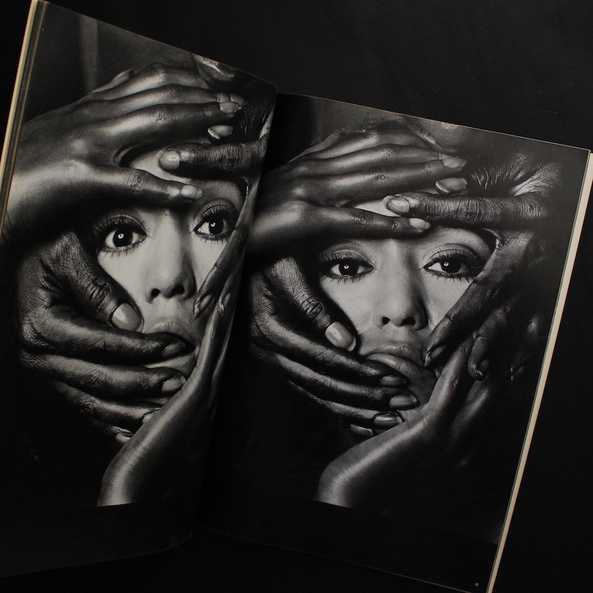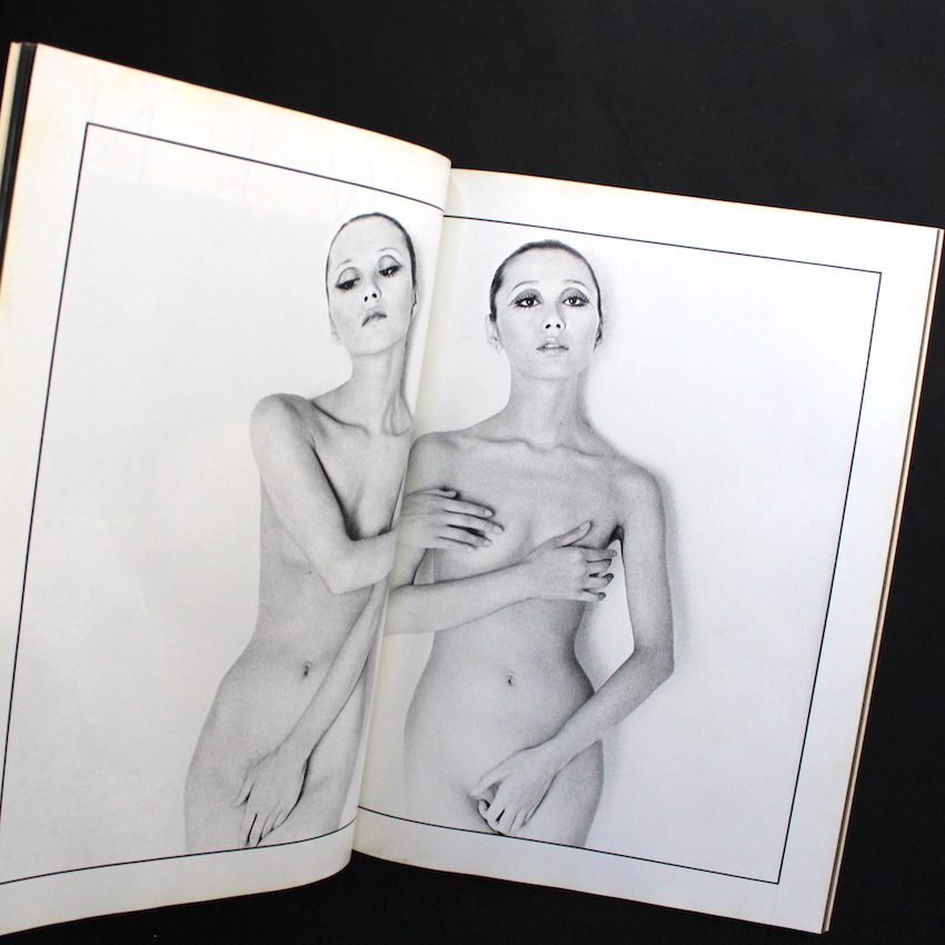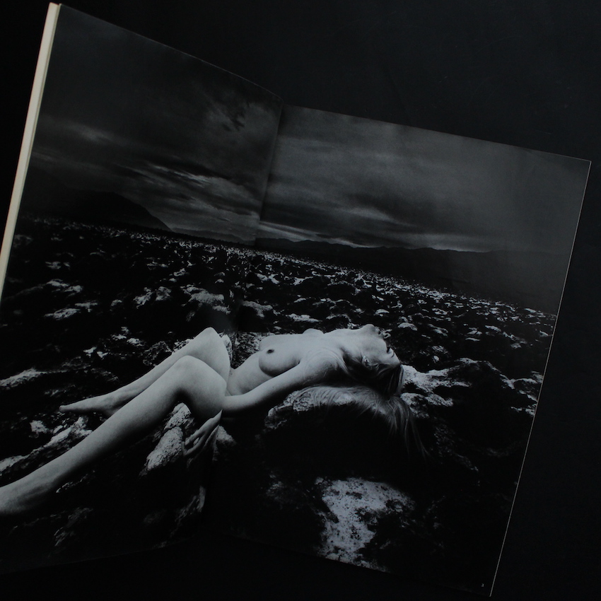 日本を代表する写真家のひとりである篠山紀信の写真集『Nude(Softcover, Signed)』。日本大学芸術学部写真学校では「写真の技術」を、夜間で通っていた東京綜合写真専門学校では「写真とは何か」を学んだという篠山は、在学中より名門・ライトパブリシティの写真部員で活躍、コマーシャルの世界で活躍し、60年代後半にフリーとなって以降は、当時トップモデルの一人であった松田和子や歌手・丸山明宏らをつぎつぎにハダカにし、「脱がせ魔・篠山」とまで言われ、マスコミで騒がれていました。以降現在までに至る活躍は周知の通りですが、本書はフリーに転身後、ヌードドキュメントや裸体の造形美を写し出す作品を創作して篠山のヌード作品を収録したタブロイド版の作品集。編集は山岸章二。装丁・構成は細谷巌。写真家サイン入り。