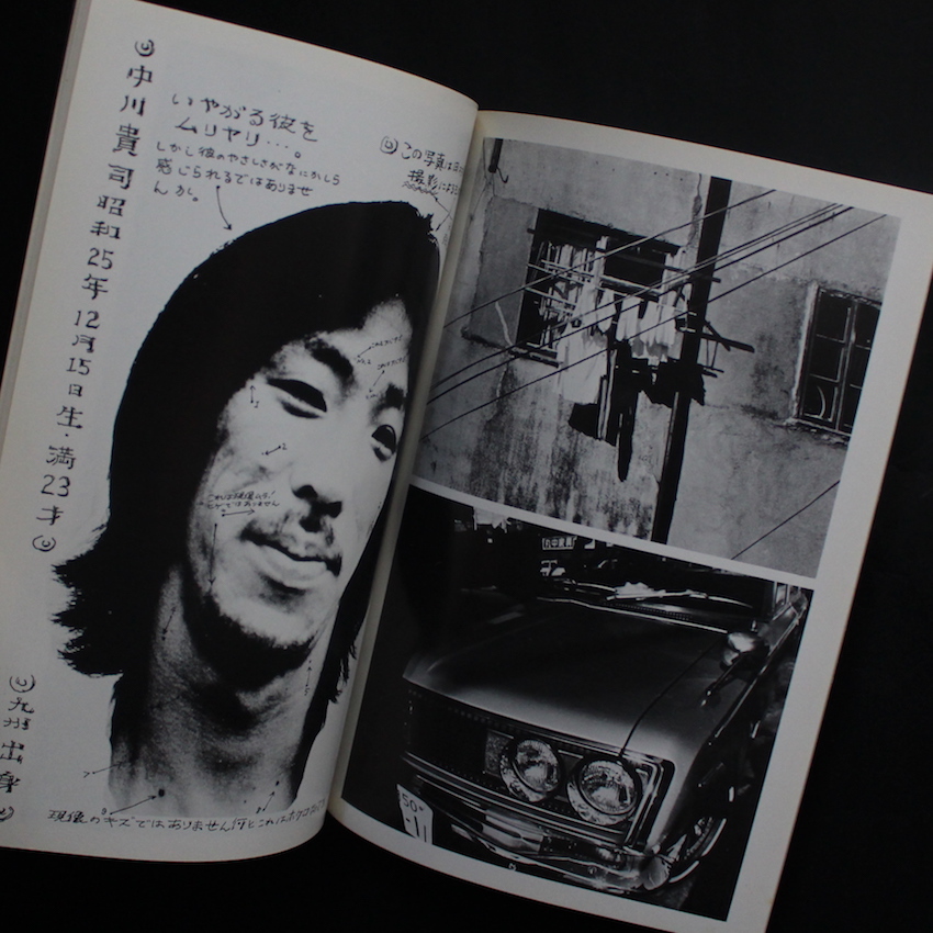 本書は、1972年以来5年間に渡って、合計第10号まで刊行された写真同人誌『地平 / Chihei』の第7号。5号発刊から1年の空白期間を経て刊行された一冊です。1970年前後の『Provoke』に触発されて、「写真とは?」「撮る行為とは?」と自問自答を繰り返し、さらにはカメラ雑誌に拠らない作品の発表(オフマガジン化)を模索していた写真家たちが、自らの手で写真集やZineのようなスタイルで雑誌形態の作品集を刊行するようになった70年代。その中でも、メンバーの努力と5年の継続で、群を抜くクオリティーの高さで、高い評価を誇ったのが『地平』。大阪写真専門学校(ビジュアルアーツ専門学校・大阪)の教員だった百々俊二、黒沼康一らを中心メンバーとして、毎号数名のメンバーが作品を発表していくのですが、本号は、作品集『Boy』でも知られる中川貴司の特集号となっており、36ページまで中川の作品が掲載されています。