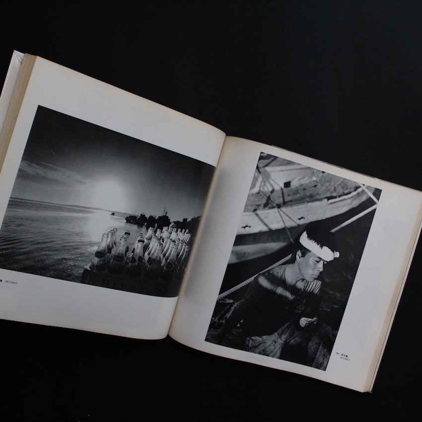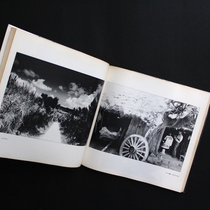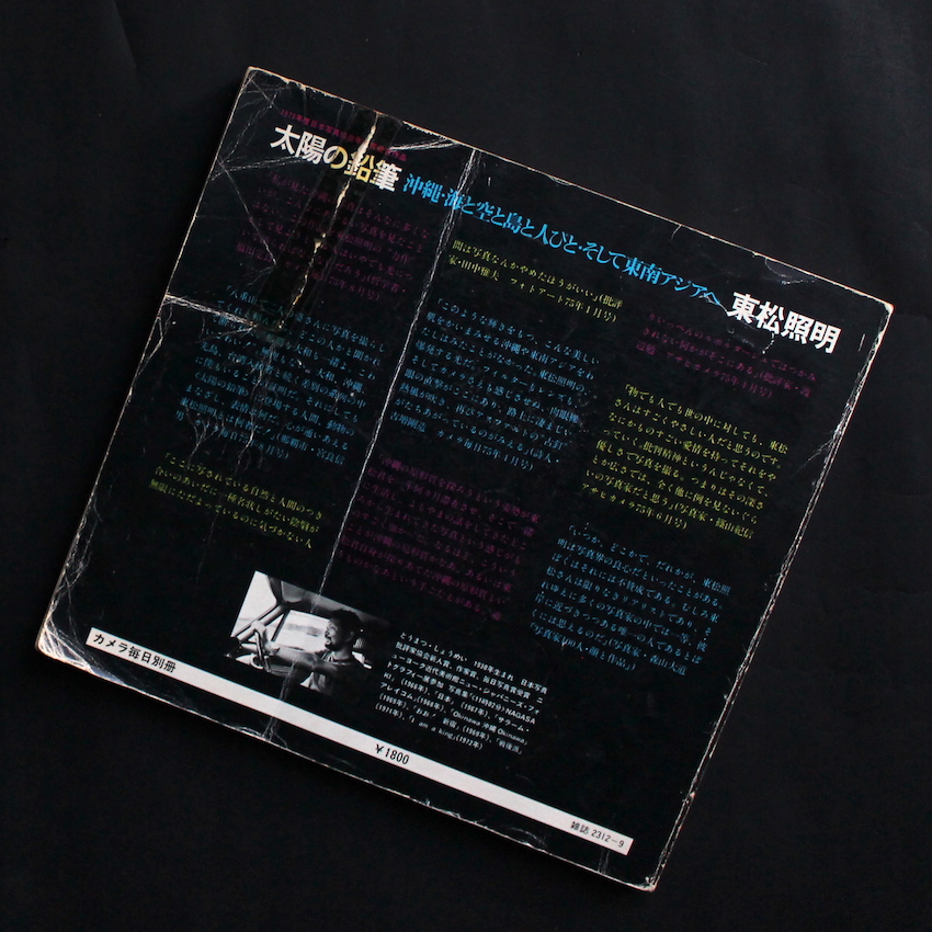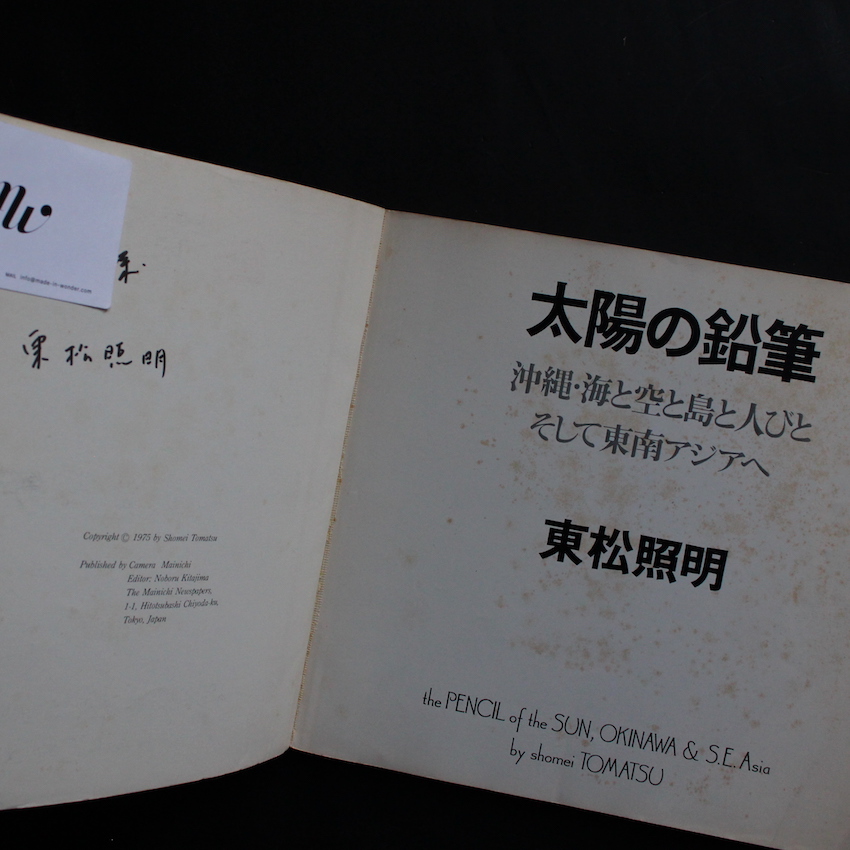 日本の写真家・東松照明の写真集『太陽の鉛筆 -The Pencil of the Sun,Okinawa & S.E.Asia-(Signed)』。「<11時02分>NAGASAKI」「おお!新宿」「日本」「I am a king」さらには沖縄を題材とした写真集など多くの名作を発表し、アメリカ・ヨーロッパでも数々のエキシビジョンが開催され、世界的にも評価が高い日本を代表する写真家東松照明。本書は、1975年のカメラ毎日の別冊として発売され、1969年のアメリカ占領下から本土復帰までの沖縄の姿(海・空・島・人)を捉えたドキュメンタリー写真で、日本写真家協会年度賞及び芸術選奨文部大臣賞を受賞した東松照明の名作に数えられる一冊。前半は沖縄の島々のモノクロ写真、後半は東南アジア各国のカラー写真で構成され、70年代のモノクロからカラー写真への移行も体現されています。東松は自身が収めてきたモノクロには「アメリカ」が見え隠れしていると考え、太陽の鉛筆を最後にカラー写真へと移行することになります。尚、2015年に改訂新版が刊行されていますが、本書は初版。謹呈署名入り(但し、カバーイタミ大及びテープ補修あり)。