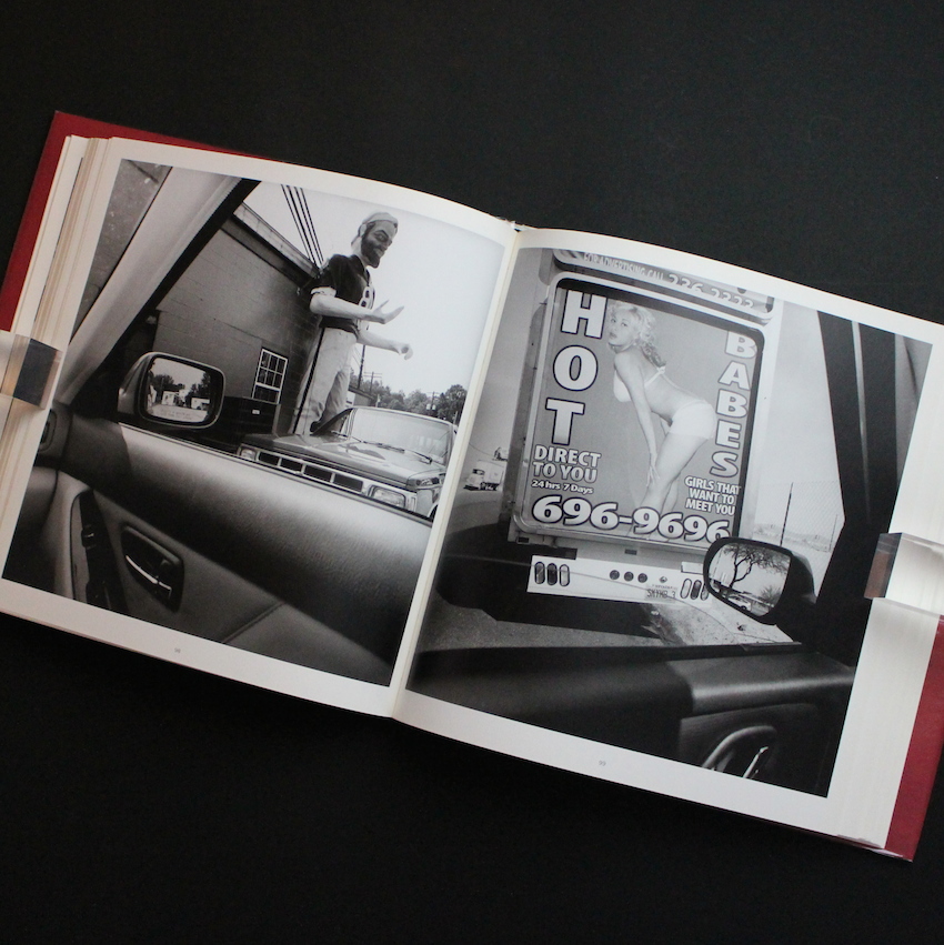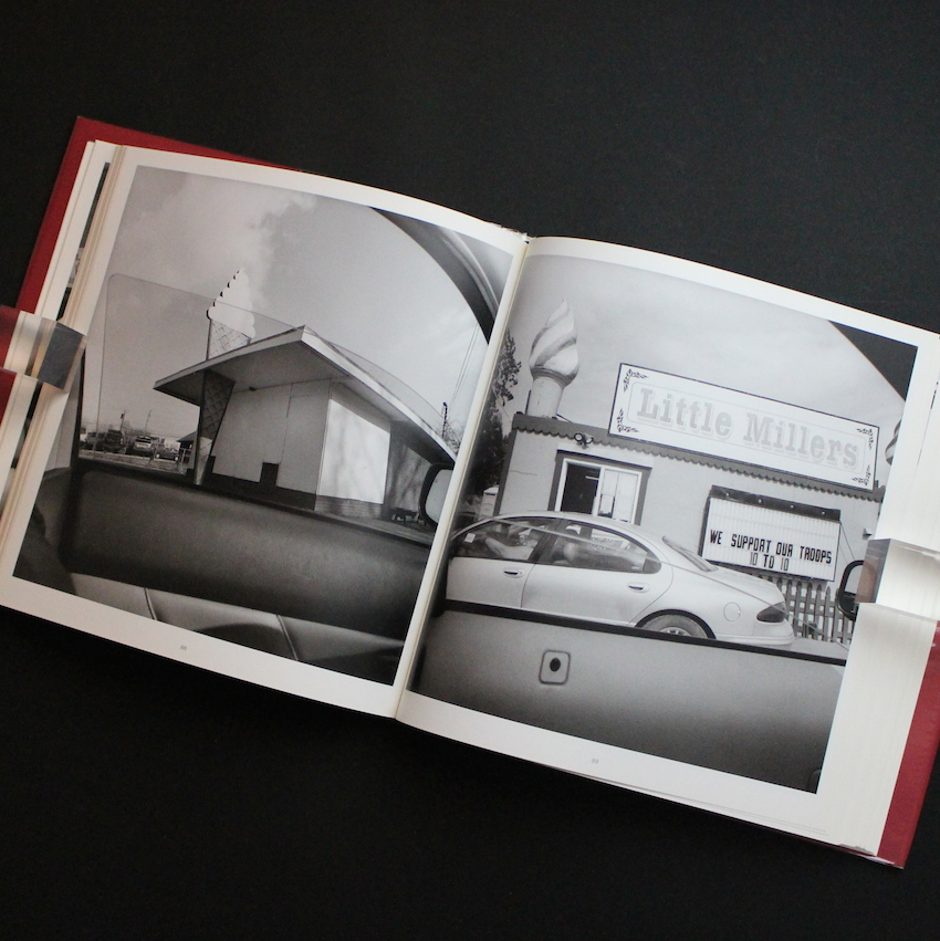 著名な写真ギャラリーで過去に多くの傑作写真集を刊行しているサンフランシスコのフランケルギャラリーより2010年に発表されたリー・フリードランダーの写真集『America by Car』。1960年代以降の日常的・私的な’’ニュー・ドキュメンタリー’’写真の代表格で、現在も現役で活躍するアメリカ写真界の巨匠リー・フリードランダー。都市と人間の何気ない光景へのまなざしとその計算されたコンポジションによるユニークな写真は多くの写真ファンを魅了し続けています。本書は、アメリカ本土の数十州をレンタカーで周り、車のフロント・サイドガラスをフレームに見立てて、現在のアメリカの何気ない光景や人々の撮影を試みたユニークな作品。写真全体の構図のみならずサイドミラーに写る光景の構図までも計算された作品には脱帽です。