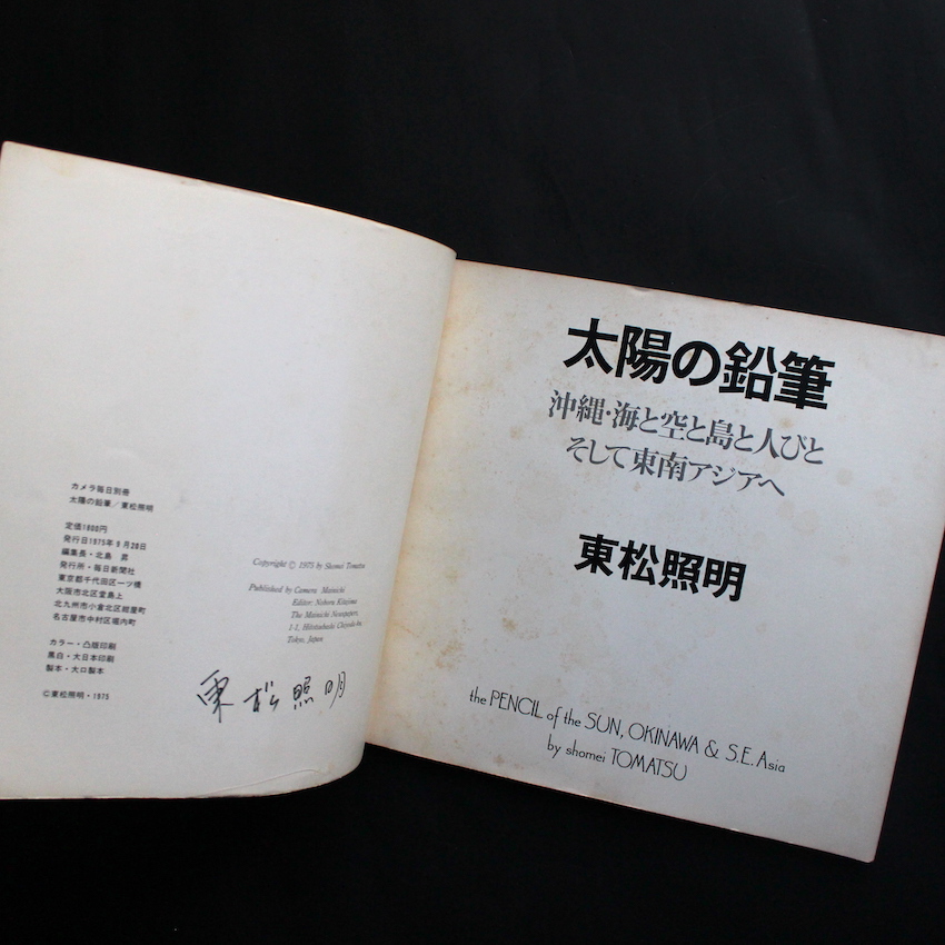 日本の写真家・東松照明の写真集『太陽の鉛筆 -The Pencil of the Sun,Okinawa & S.E.Asia-(Signed)』。「<11時02分>NAGASAKI」「おお!新宿」「日本」「I am a king」さらには沖縄を題材とした写真集など多くの名作を発表し、アメリカ・ヨーロッパでも数々のエキシビジョンが開催され、世界的にも評価が高い日本を代表する写真家東松照明。本書は、1975年のカメラ毎日の別冊として発売され、1969年のアメリカ占領下から本土復帰までの沖縄の姿(海・空・島・人)を捉えたドキュメンタリー写真で、日本写真家協会年度賞及び芸術選奨文部大臣賞を受賞した東松照明の名作に数えられる一冊。前半は沖縄の島々のモノクロ写真、後半は東南アジア各国のカラー写真で構成され、70年代のモノクロからカラー写真への移行も体現されています。東松は自身が収めてきたモノクロには「アメリカ」が見え隠れしていると考え、太陽の鉛筆を最後にカラー写真へと移行することになります。尚、2015年に改訂新版が刊行されていますが、本書は初版。写真家サイン入り。